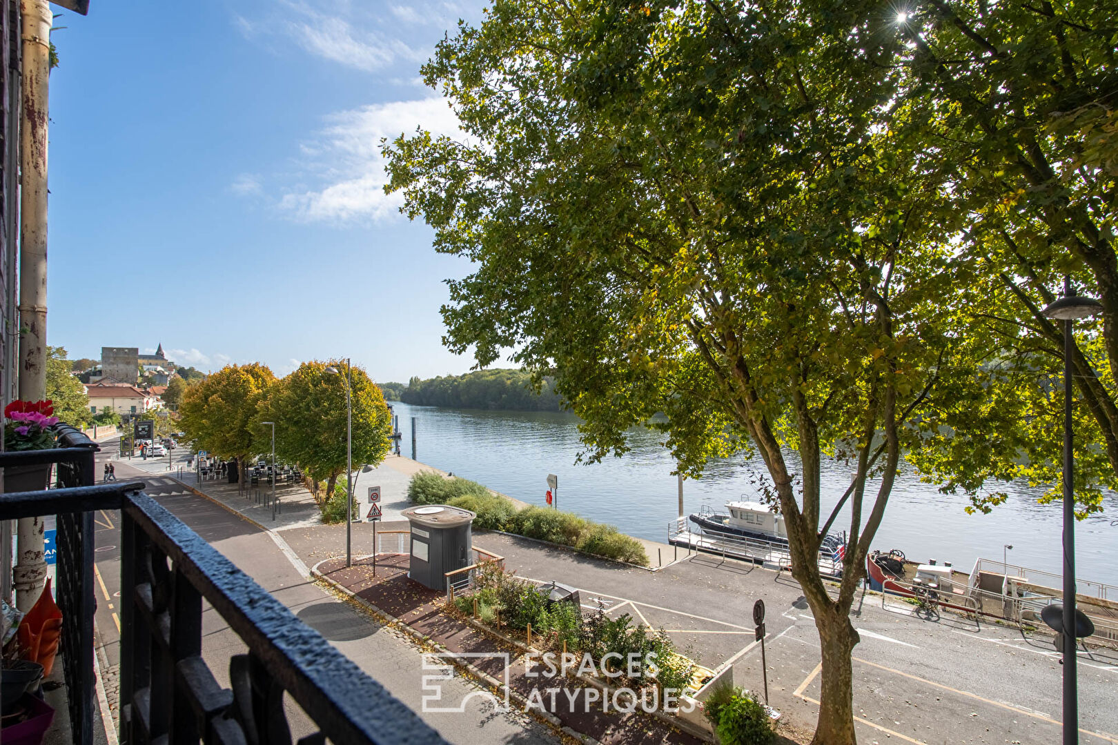 Located in the city center of Conflans-Sainte-Honorine, with a superb unobstructed view of the Seine, this charming 80 m2 apartment takes place on the 2nd floor of a character building from the 1920s and benefits from a pleasant shared garden. within the condominium.