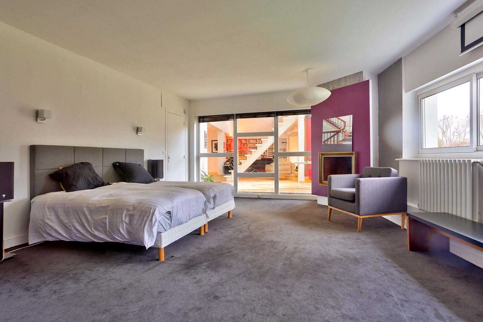 The ground floor : The large entrance hall opens onto the bright and welcoming living room-cathedral of 100 sqm, with a ceiling height of up to 8 m at the highest point, including an elegant closed fireplace. Four French windows open onto two large terraces located on either side of the living room. The fully equipped Bulthaup / Gaggenau kitchen, bordered by movable glass walls, communicates with the dining room, the sliding window of which provides access to the rear terrace. From there, a corridor serving a WC, leads to a laundry room and to a small studio with its bathroom, with its own exit to the garden. On the other side of the living room, the south wing (XXIIIth century) has a large master bedroom with bathroom and WC; a large bright office and a second large bedroom with private bathroom and WC, benefiting from its own exit to the garden.