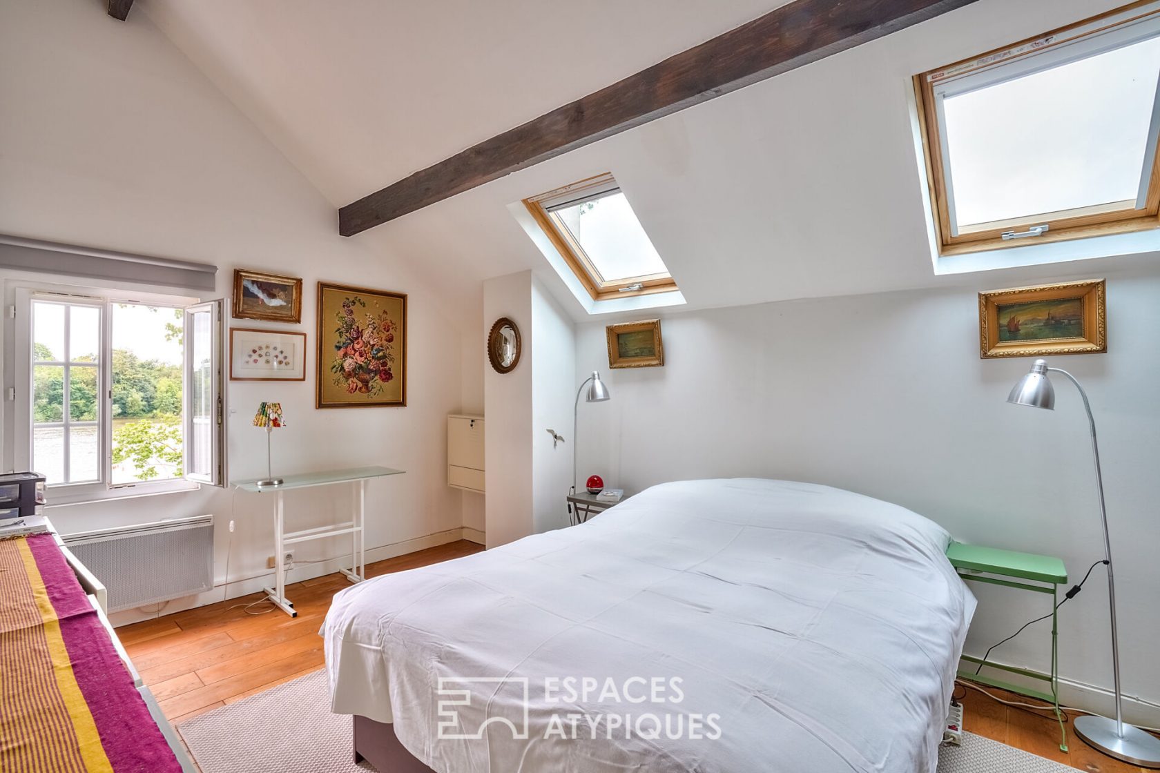 Access is by a bridge, private and secure, reserved for residents and their guests with the presence of a guardian. The house is organized on three levels. The garden level opens onto a large bedroom, a bathroom and a veranda with direct access to the garden. The 1st floor, accessible from the garden level or from the outside, lets you discover the beautiful living room, with open kitchen, flooded with light in all seasons by its many bay windows opening onto the terrace. It overlooks the garden and the Seine to fully enjoy the tranquility of this unique place.
