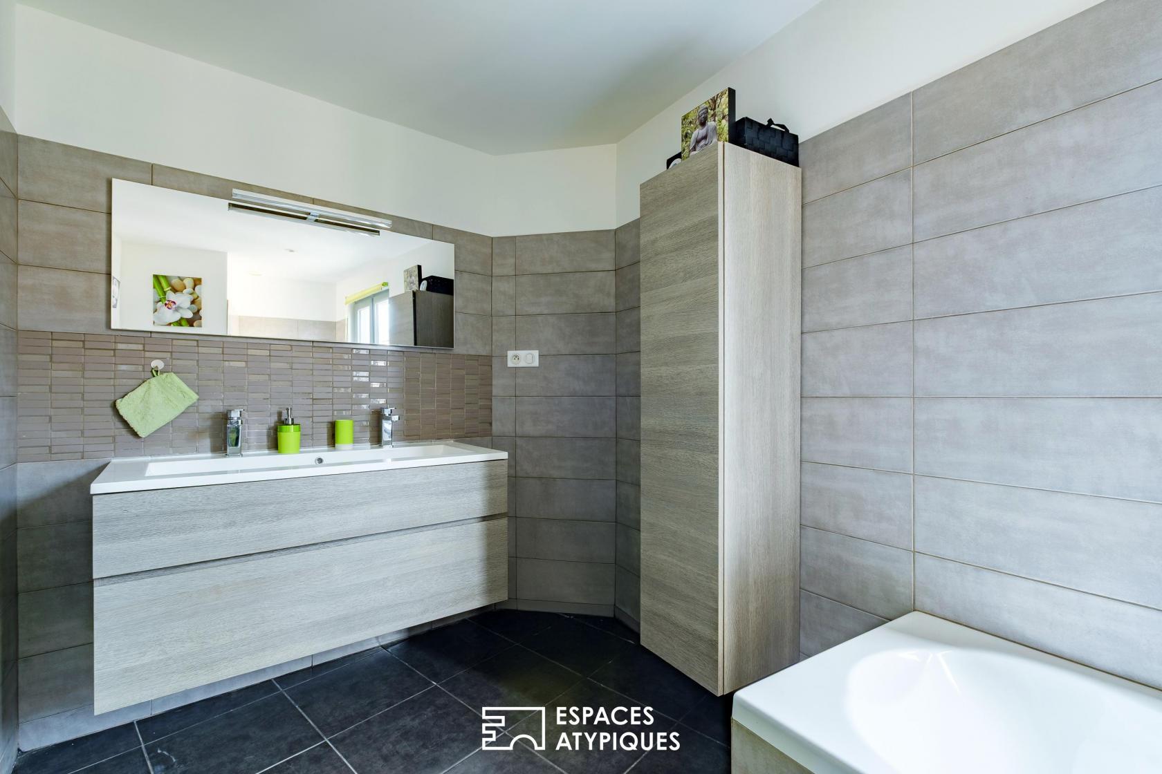 The modern open-plan kitchen, separated by a glass partition in a workshop style and featuring a convivial breakfast bar, encourages shared meals. This first level also includes a bedroom with its own shower room, ideal for single-level living or for hosting guests. The upper floor is dedicated to relaxation. The sleeping area comprises a comfortable master suite, two further bedrooms with dressing rooms, and a large family bathroom.