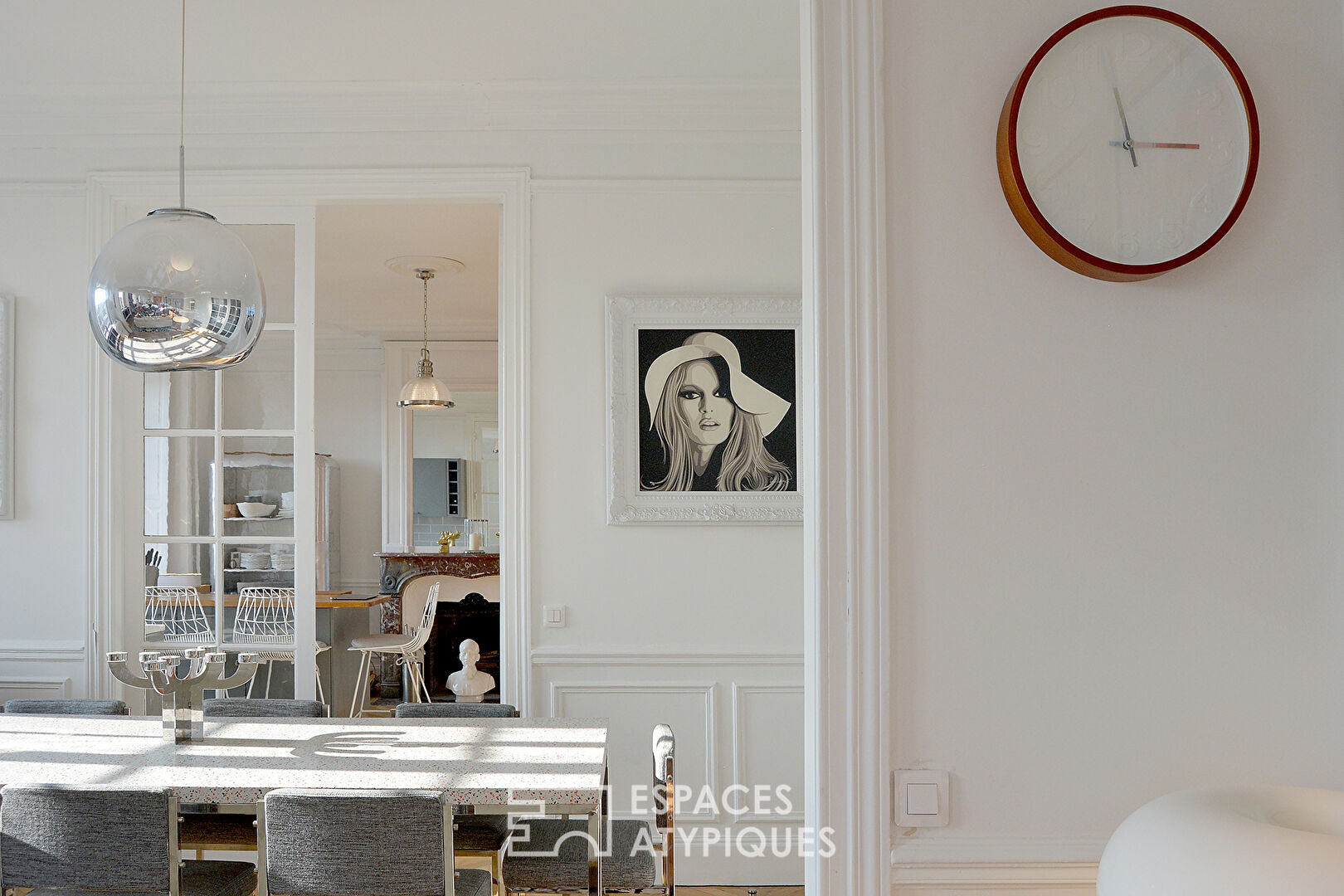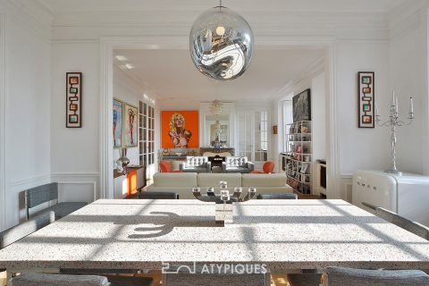 The interior is distinguished by generous volumes and a total renovation that respects the authenticity of the old architecture, while integrating modern elements. The old parquet flooring and moldings that adorn each room bring an undeniable cachet.