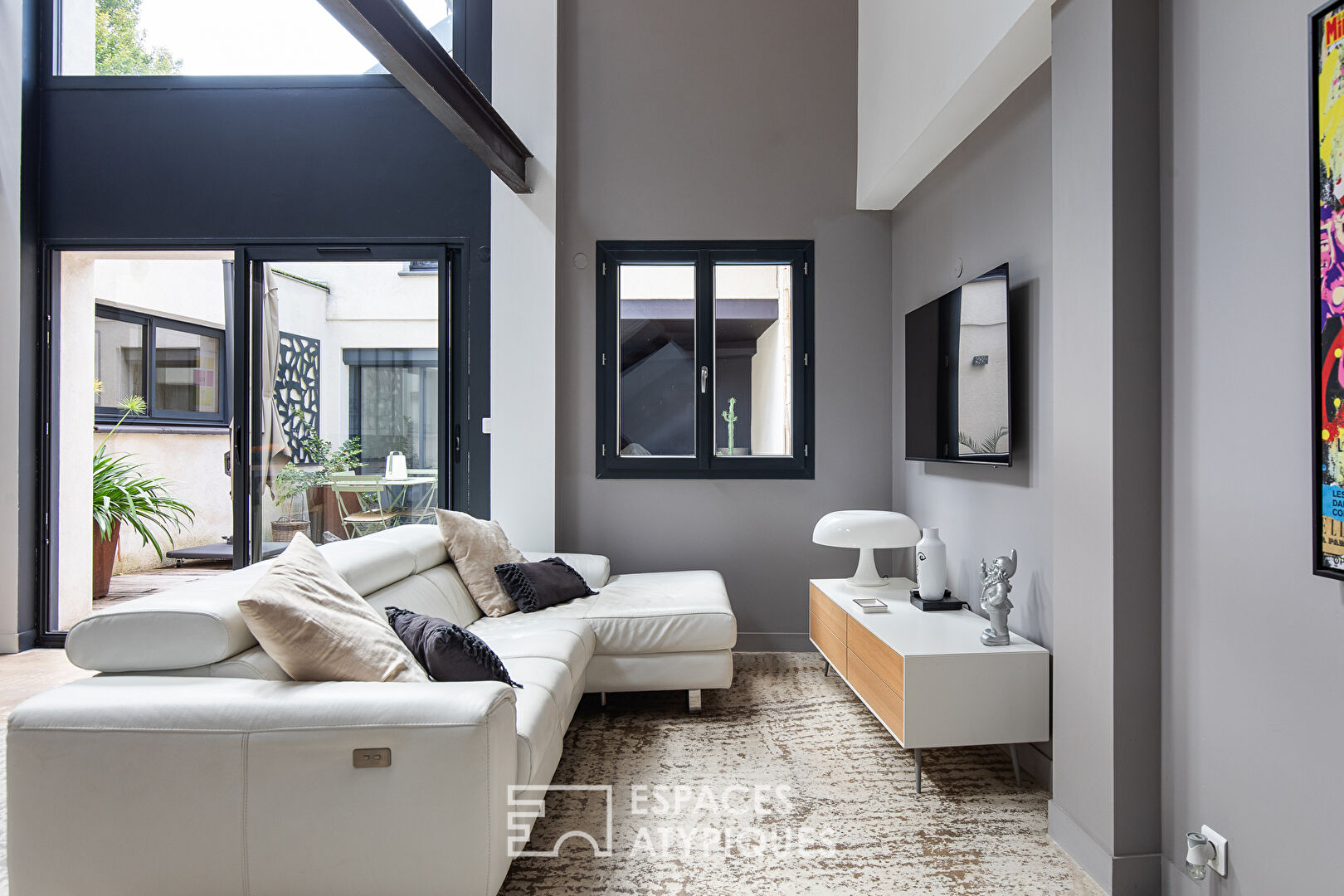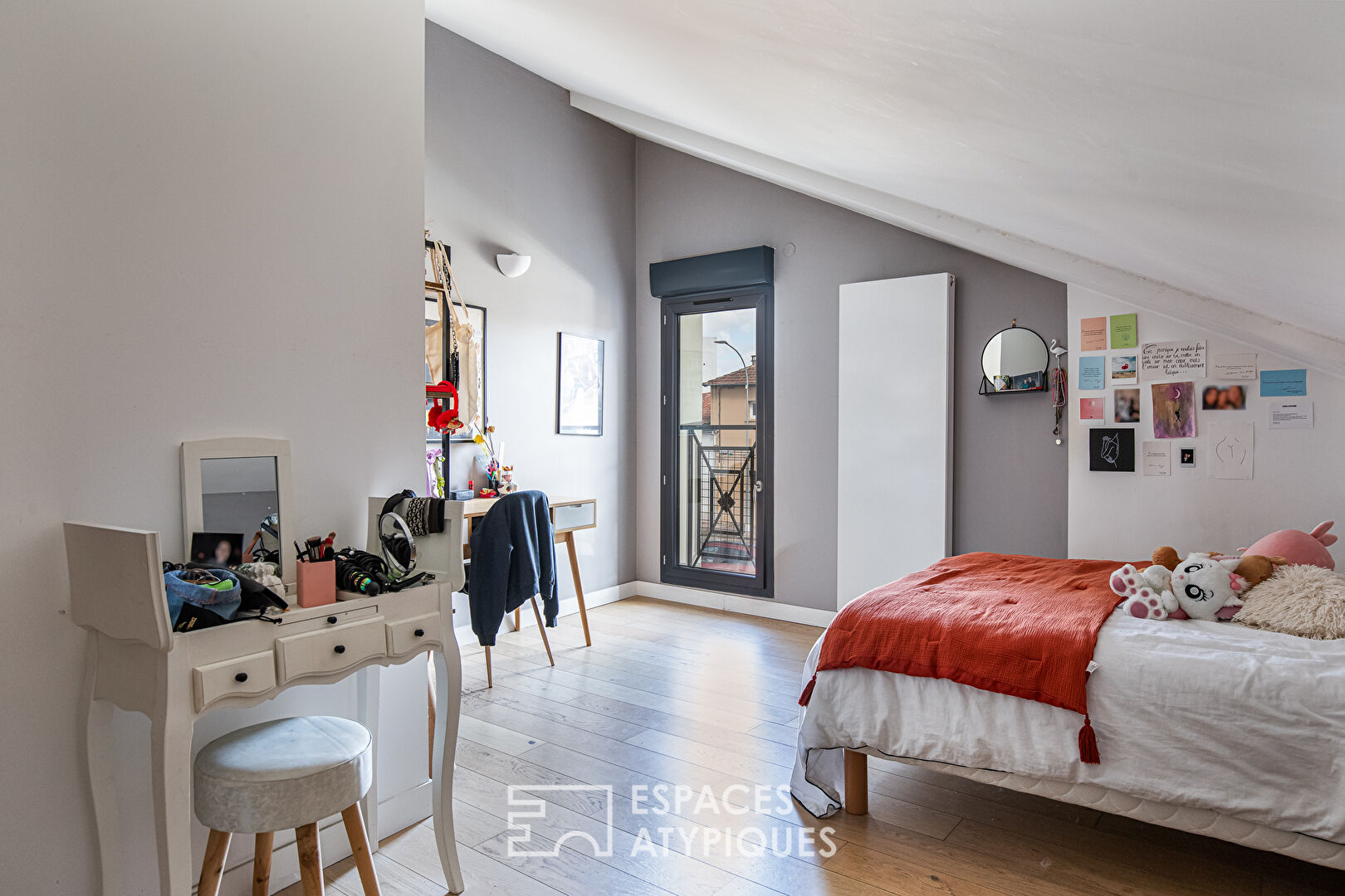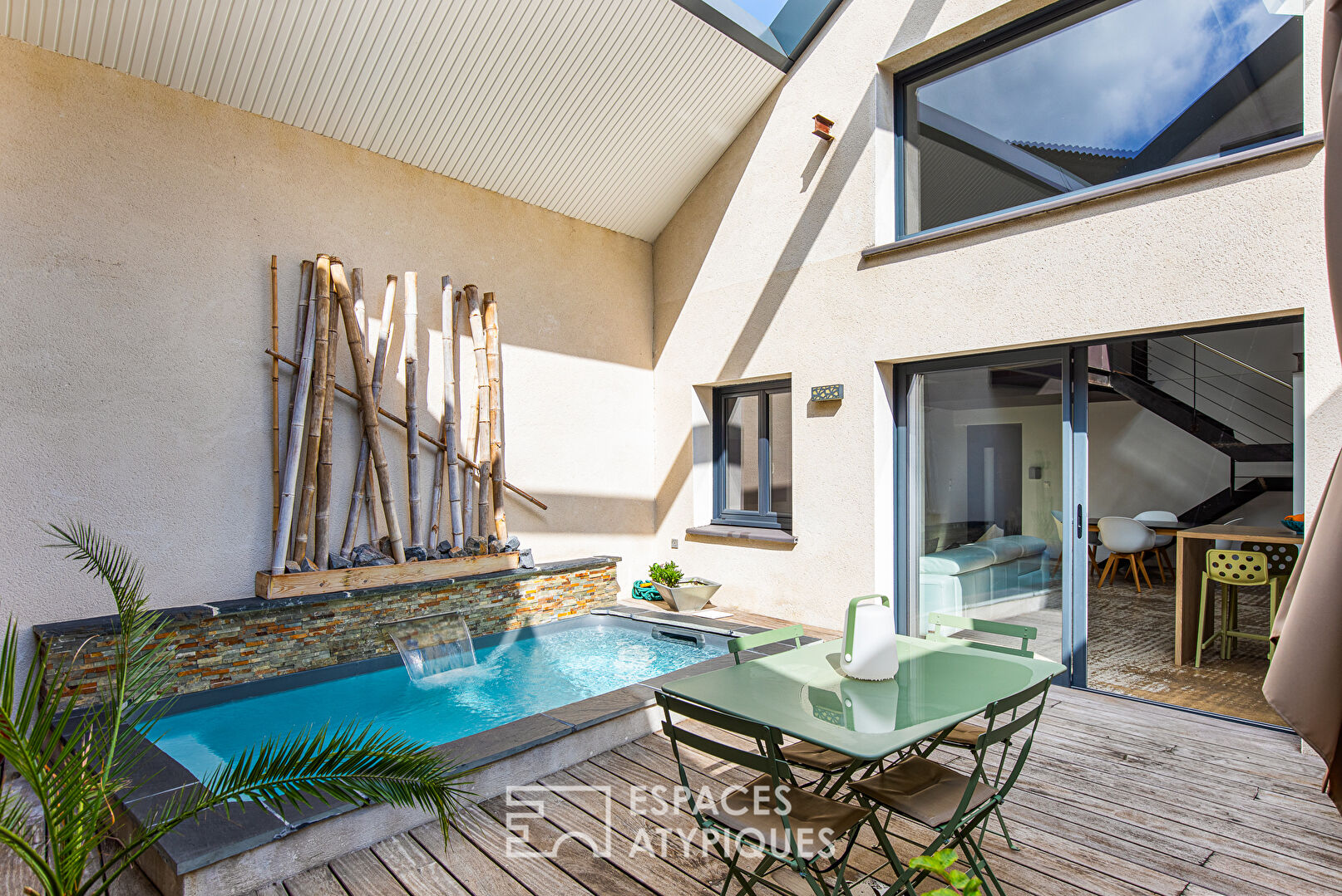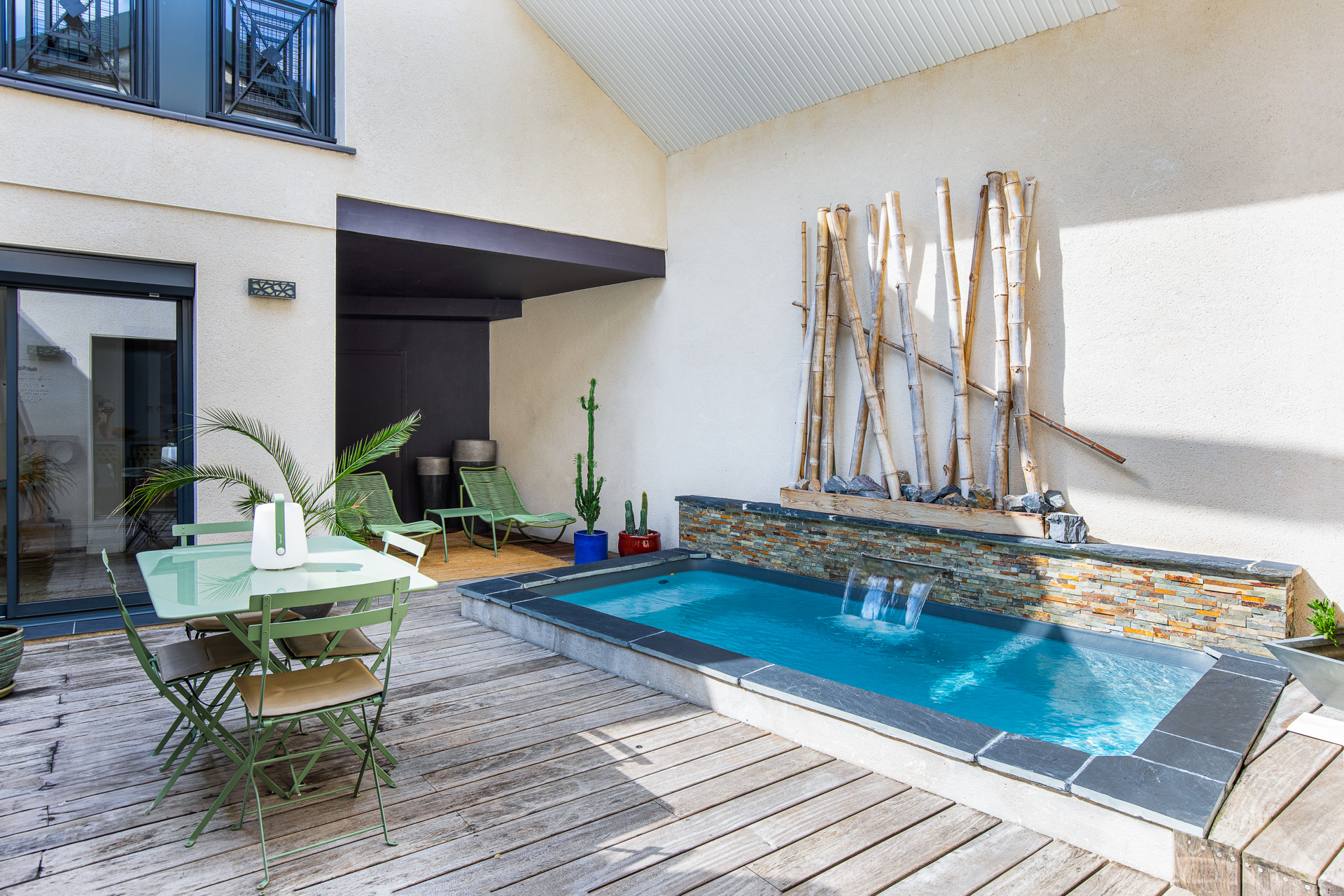 With beautiful volumes, this contemporary house of approximately 199 sqm seduces with its originality and singularity, a stone’s throw from the city center. Its outdoor patio, decorated with a wooden terrace and a swimming pool, provides a magnificent relaxation area and is positioned as the heart of this house. The facade accommodates a double garage with automated doors and an airlock, which secures access to the house. The front door opens onto a corridor with cupboards and a toilet, and gives access to the living room bathed in light thanks to its skylights and bay windows. The charm is immediately apparent with this magnificent polished concrete floor, this staircase and these raw metal beams. The open kitchen, from a major brand, has a pantry-laundry room and a second access to the garage. The staircase leads us to two mezzanine spaces that can be suitable for an office area, or for another use. Upstairs, two bedrooms, each 18sqm, with sloping ceilings, have built-in cupboards and a shower room located between the two rooms. Back on the ground floor, where a corridor runs along the patio and leads to a TV room, a storage room, terrace access, a toilet, and a shower room. Another staircase leads us to the 25sqm master suite, located in the other wing of the house, and with a shower, a bathtub and plenty of storage space. In excellent condition, this recent house benefits from high-end services, a high-performance heating system and thermal insulation. Double garage / Underfloor heating and radiators upstairs / Recent renovation / 2m x 5m swimming pool / 35 sqm terrace ENERGY CLASS C / CLIMATE CLASS C Estimated average amount of annual energy expenditure for standard use, based on 2021 energy prices: between EUR1,010 and EUR1,440 Information on the risks to which this property is exposed is available on the Géorisques website: www.georisques.gouv.fr