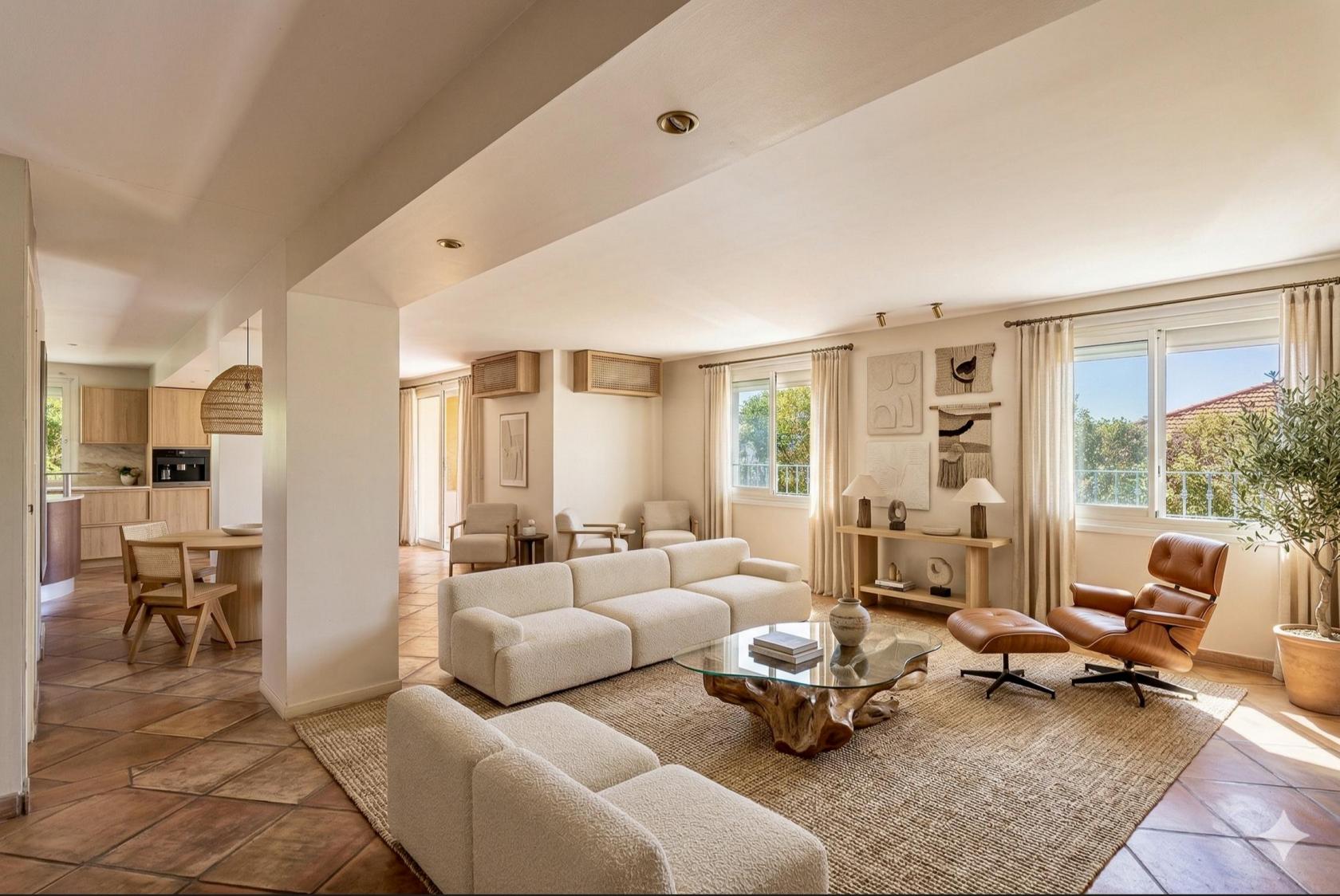 The seven rooms, including a master suite and several generously sized bedrooms, maintain a refined atmosphere, with custom-designed dressing rooms and two bathrooms. The landscaped exterior is structured around an elegant Diffazur swimming pool and sun-drenched terraces, surrounded by lush Mediterranean vegetation for complete privacy.