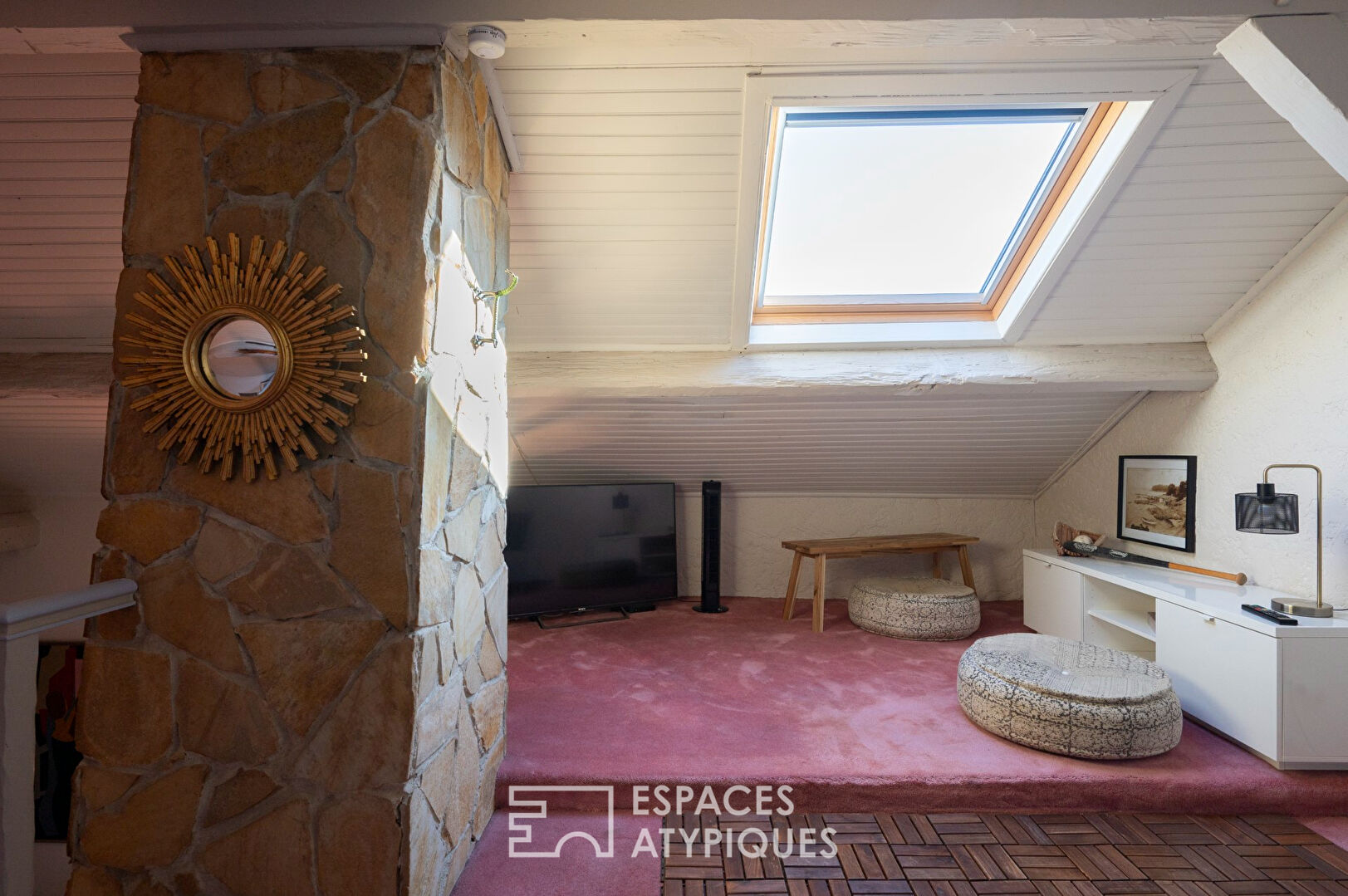 The whole also opens onto the balcony terrace leading to a small loggia with shower and laundry room. A private parking space can be rented near this atypical property, unique in the region.