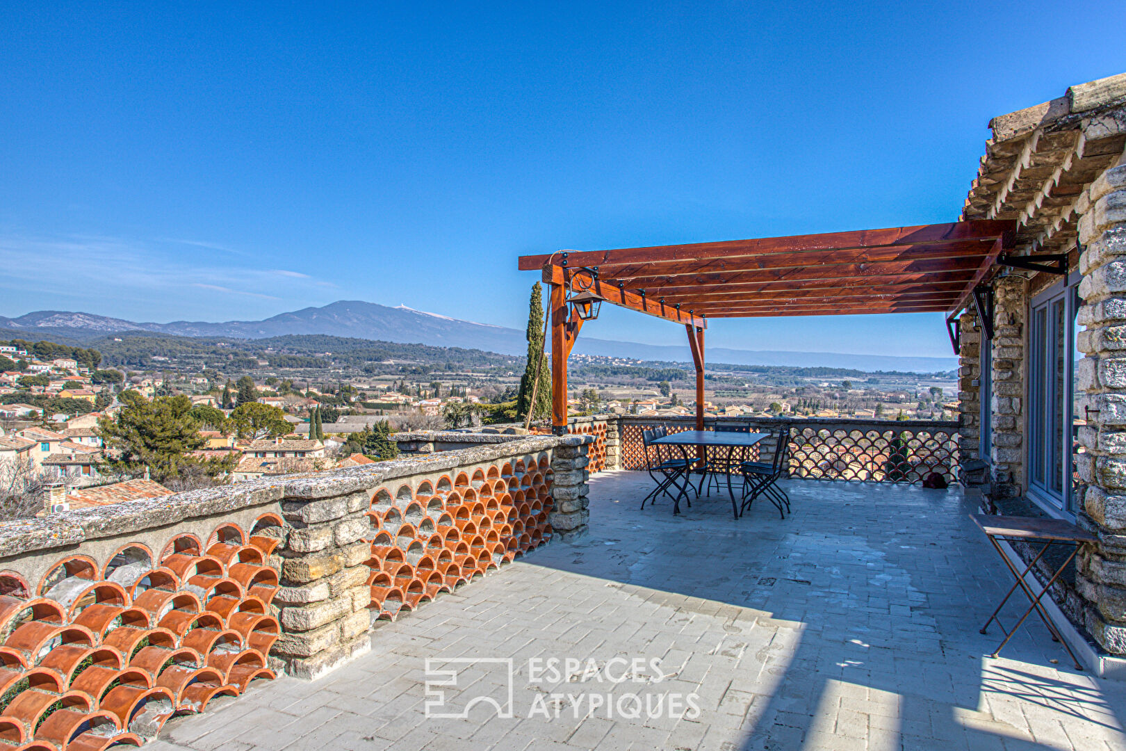 From the entrance, the authenticity and the omnipresence of noble materials operate and seduce its guests. On the ground floor, a first independent room with a water point accompanied by an adjoining bedroom suggests the possibility of exercising a liberal activity or seasonal rental. The stone staircase, sumptuous and circular, acts as the backbone of this building. Thus, it serves in turn the upper levels where we will find four new bedrooms, dressing rooms, bathrooms. Finally, on the top floor is a beautiful living space with an independent kitchen, a warm living room of 50sqm opening onto an XXL terrace offering a magnificent view of Mont Ventoux.