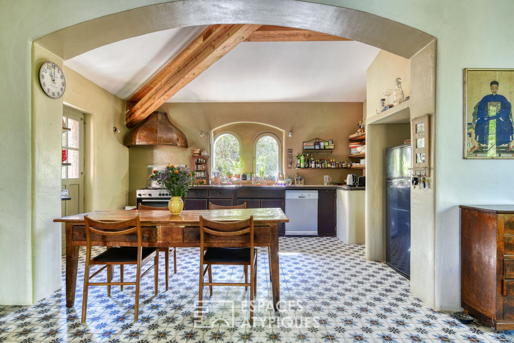 Its architecture composed of simple volumes wrapped around a large landscaped patio gives it a very monastic atmosphere. The materials used, the Ménerbes stone, the wood, the polished concrete, the cement tiles, combined with the picture windows of the workshop and the crossing views make it an original and perfect place for creation. The main living room of more than 60m2 favors volumes and beautiful perspectives.