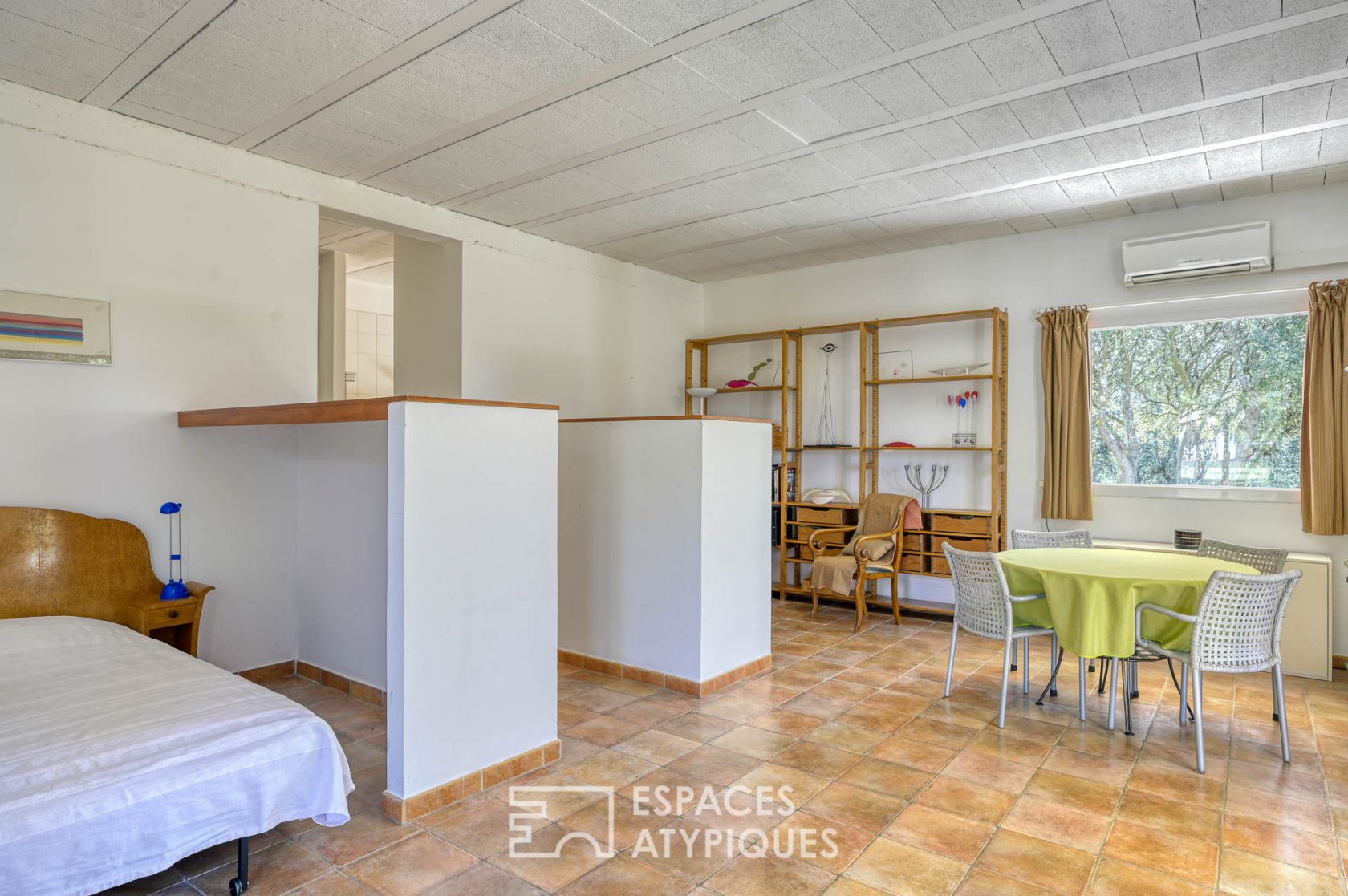 To the east, an air-conditioned building of 132 m² has an artist’s studio of 70 m² on the ground and 5 meters under a farmhouse with a mid-height gallery opening onto a panoramic terrace of 50 m². The artist’s studio communicates with a space of 52 m² furnished and equipped with a shower room and a kitchen surrounded by a terrace under a pergola.