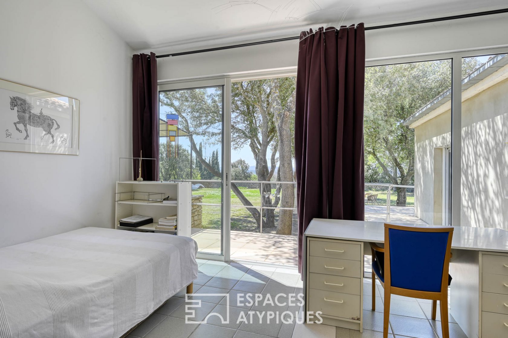 In the center, a house of 285 m² of living space offers large volumes bathed in light at all times of the day. In a setting of white walls which serve as picture rails for artists’ works, the living room, dining room, office is spread over a hundred square meters. Long sliding windows, some with brick partitions open the house onto the terrace and the grandiose landscape that surrounds it. The large, very functional kitchen also has direct access to the terrace. A parental suite of 48 m² and two bedrooms of 14 m² with shower room complete the ground floor. An elegant wooden staircase-library leads to the first floor where a 34m2 room with its bathroom and toilet offers the possibility of a fourth bedroom or a work place open to the outside thanks to a small terrace.