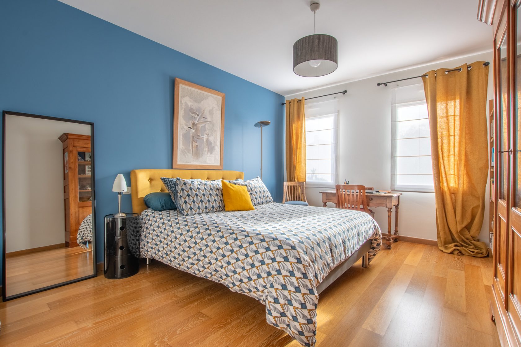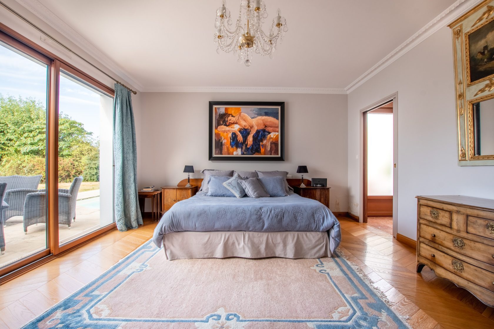 The sleeping area accommodates four large bedrooms with bathroom and dressing room, including a parental suite of nearly 35m2 with privileged access to the swimming pool, an office and a very cozy living room with its fireplace. Each room benefits from a breathtaking view to the outside.