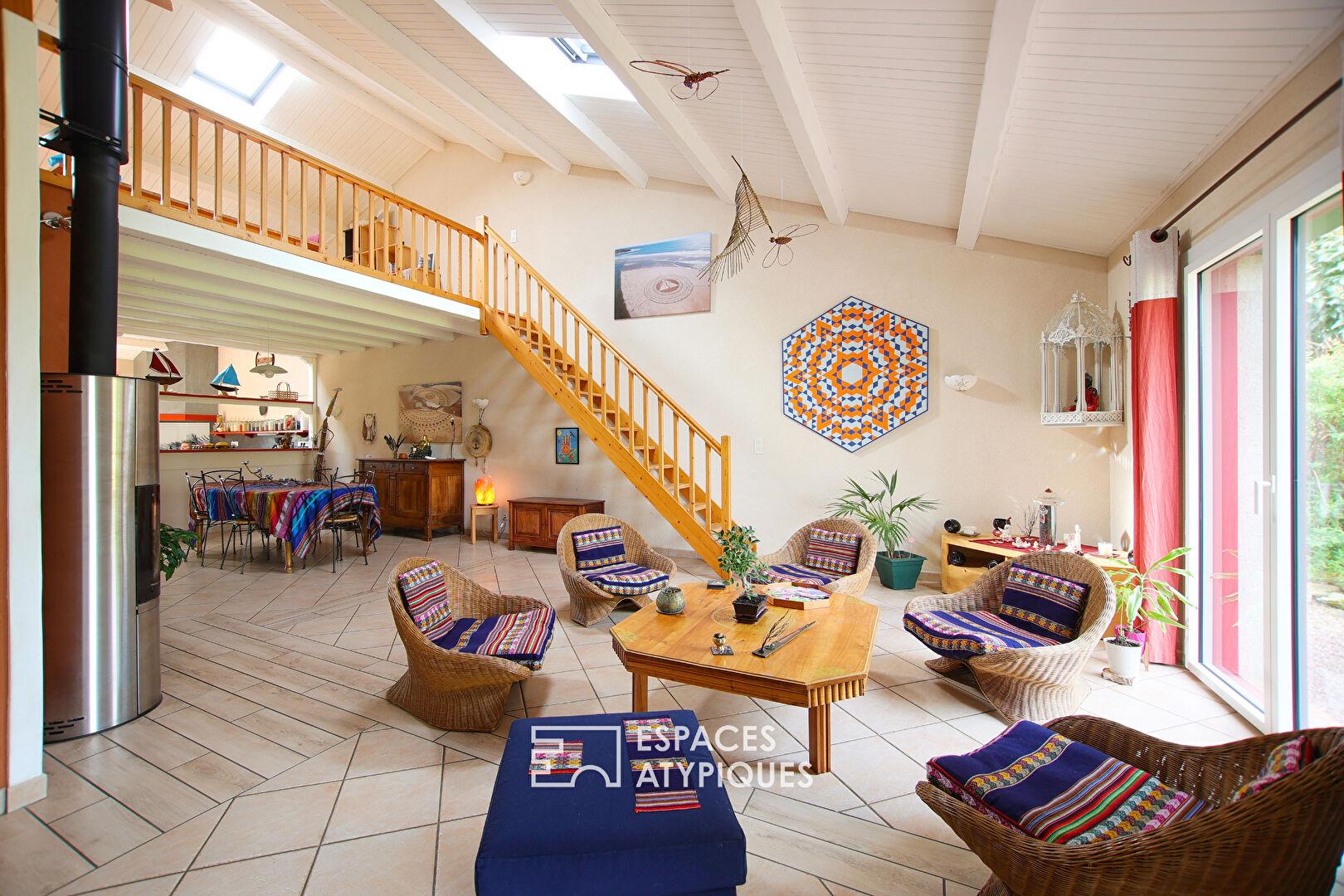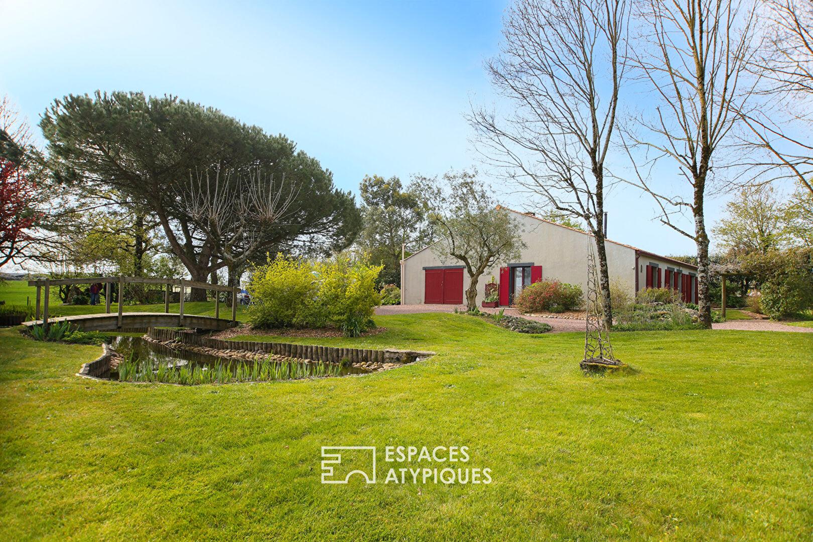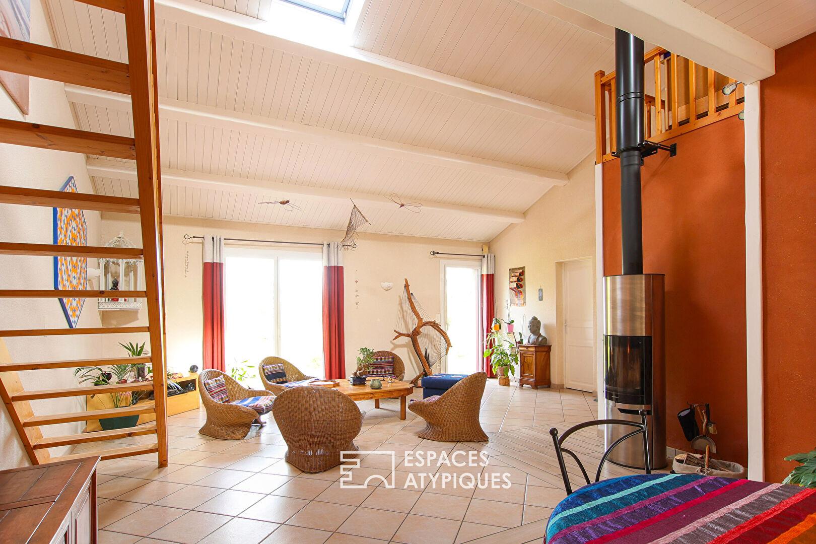 The interior is distinguished by its generous proportions and abundant natural light thanks to multiple exposures, predominantly south-facing. The spacious living and dining room, facing west, opens onto the terrace. A kitchen with a bold color scheme highlights the unique character of the property. The house offers six rooms, including three spacious bedrooms with calming atmospheres. Upstairs, a mezzanine bathed in light from skylights provides an office or relaxation space overlooking the living area. A large garage with a workshop completes this property, which is in excellent condition and heated by a high-performance geothermal system ensuring controlled energy consumption. The landscaped garden provides an exceptional green setting where a small wooden bridge and a variety of trees invite contemplation. Ideally located just 15 minutes from the beaches of Saint-Gilles-Croix-de-Vie and 30 minutes from Les Sables-d’Olonne, this residence benefits from the immediate proximity of the jewels of the Atlantic coast while remaining only an hour from Nantes airport.