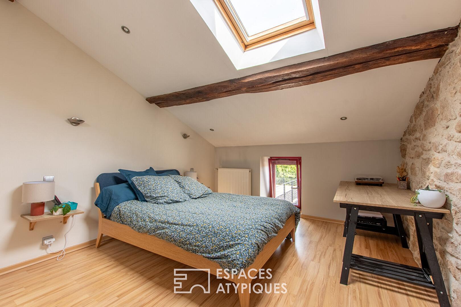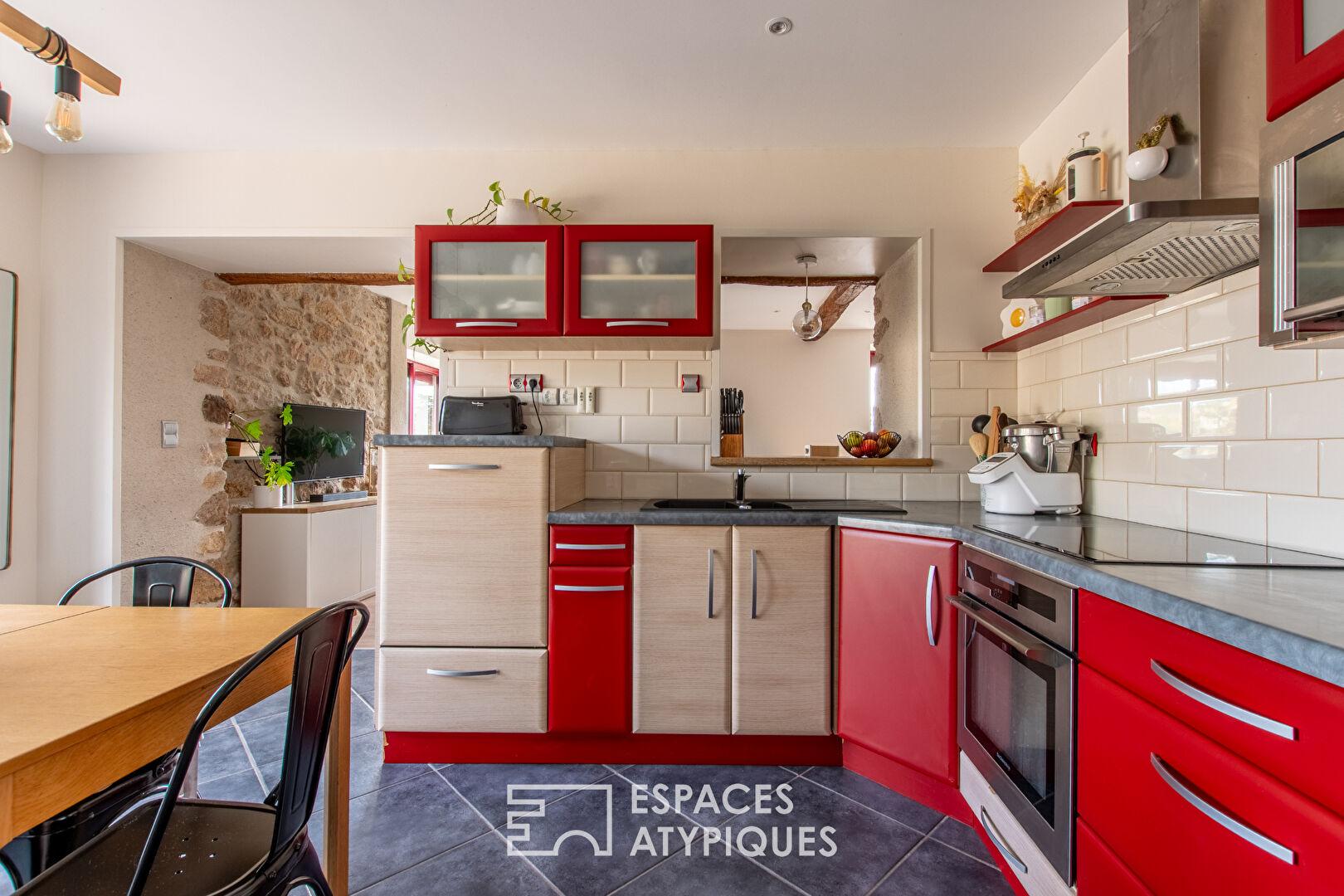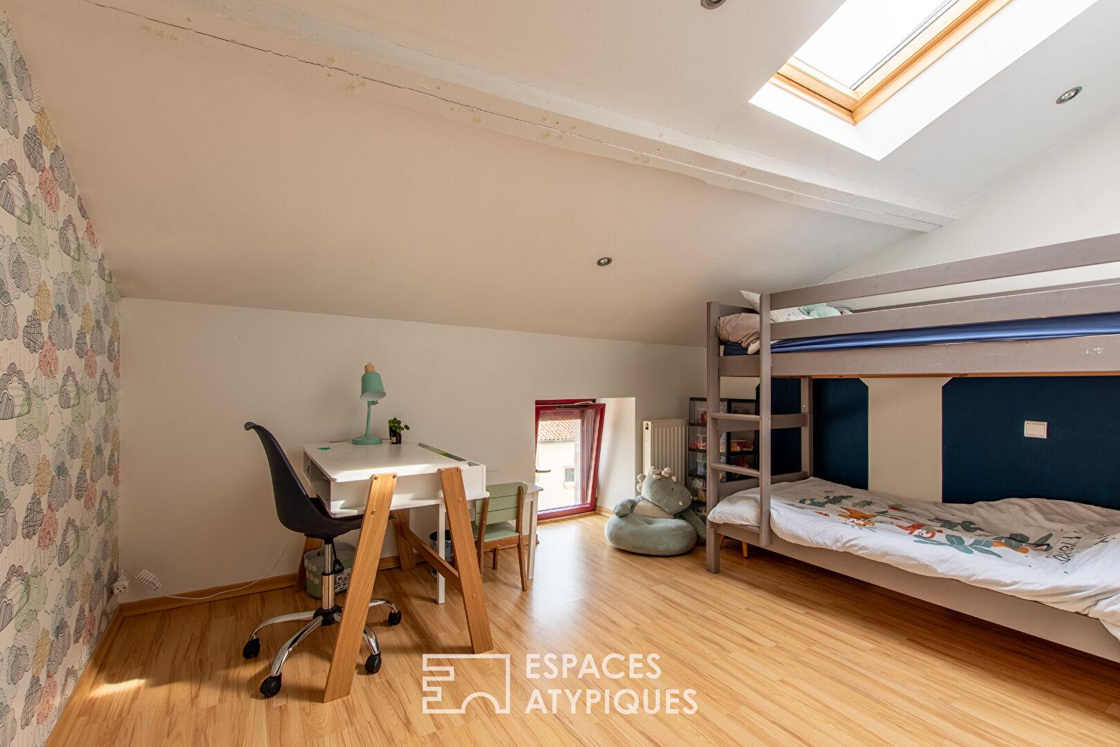 Located in the hills above the town of Mortagne-sur-Sèvre, this renovated period house offers 104 sqm of living space on a terraced plot of 714 sqm.