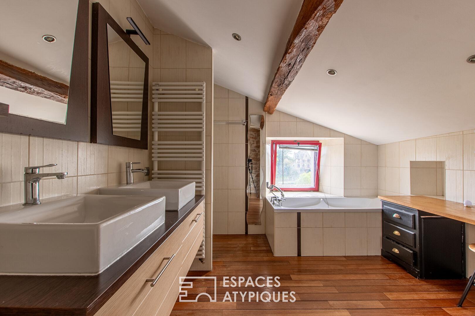 Outside, the landscaped garden is designed for enjoying warm and safe family evenings. A first terrace offers an incredible panoramic view of the verdant hillsides. The second terrace, with its integrated swimming pool and pool house, offers a different but equally inviting layout. A basement and various types of granite sheds also provide storage space. Close to shops and schools, this house is perfect for peaceful family life.
