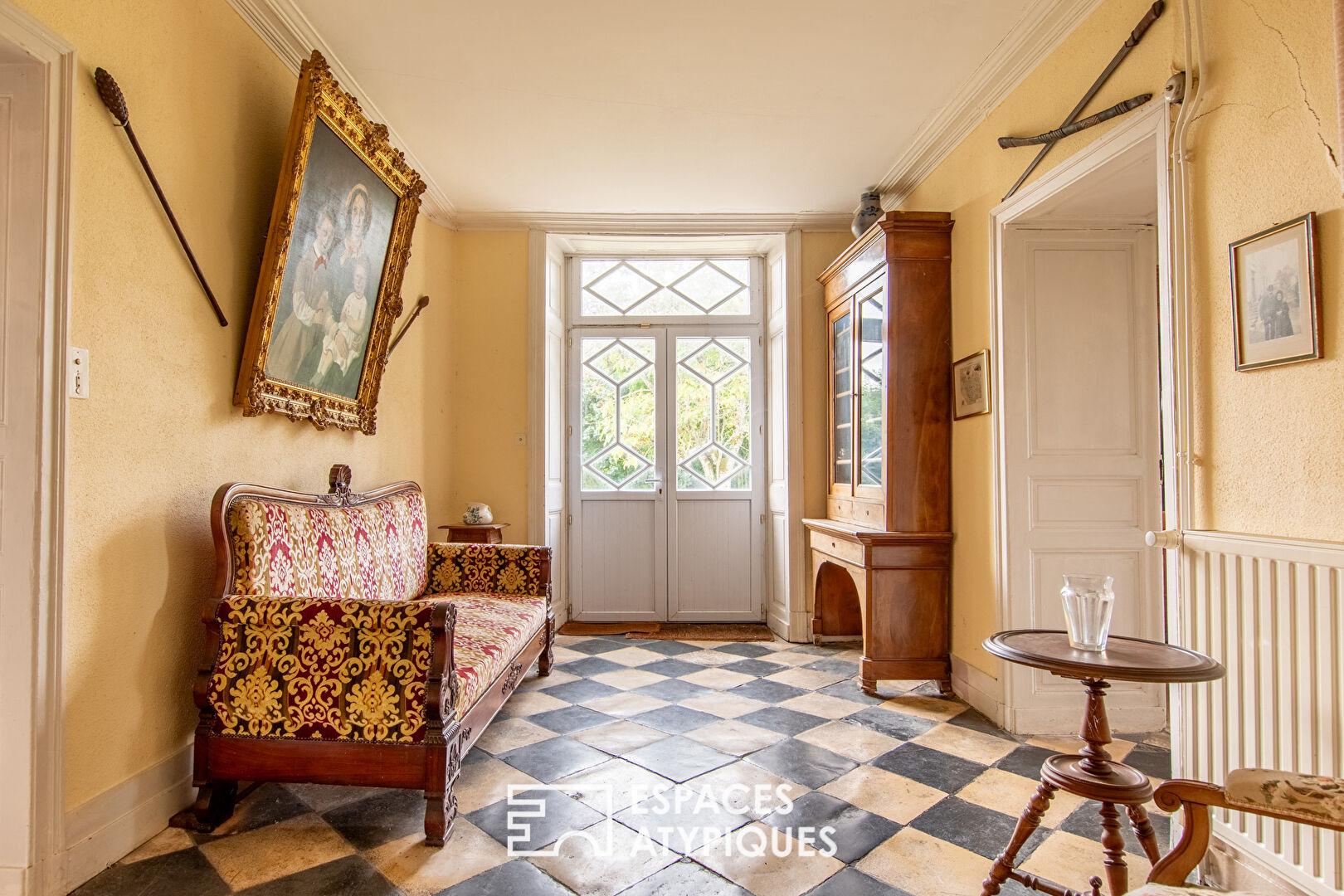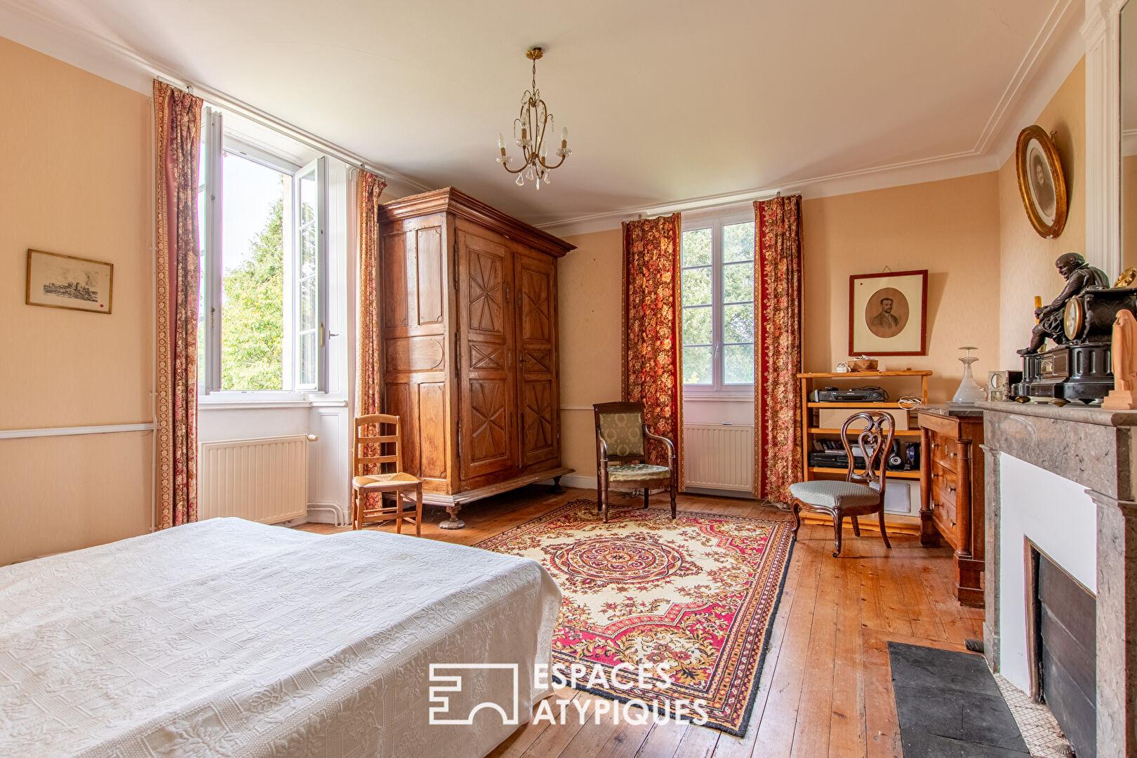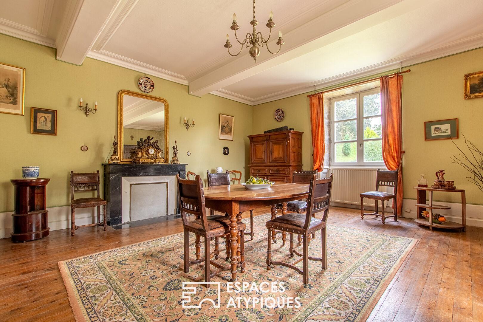 The main stone building, dating from 1850, leads to a majestic, walk-through entrance with its period checkerboard floor and solid wood staircase. The first floor features a wood-panelled kitchen, a beautiful dining room with poetic views over the park, a living room with wood parquet flooring and tapestries, and a comfortable study.