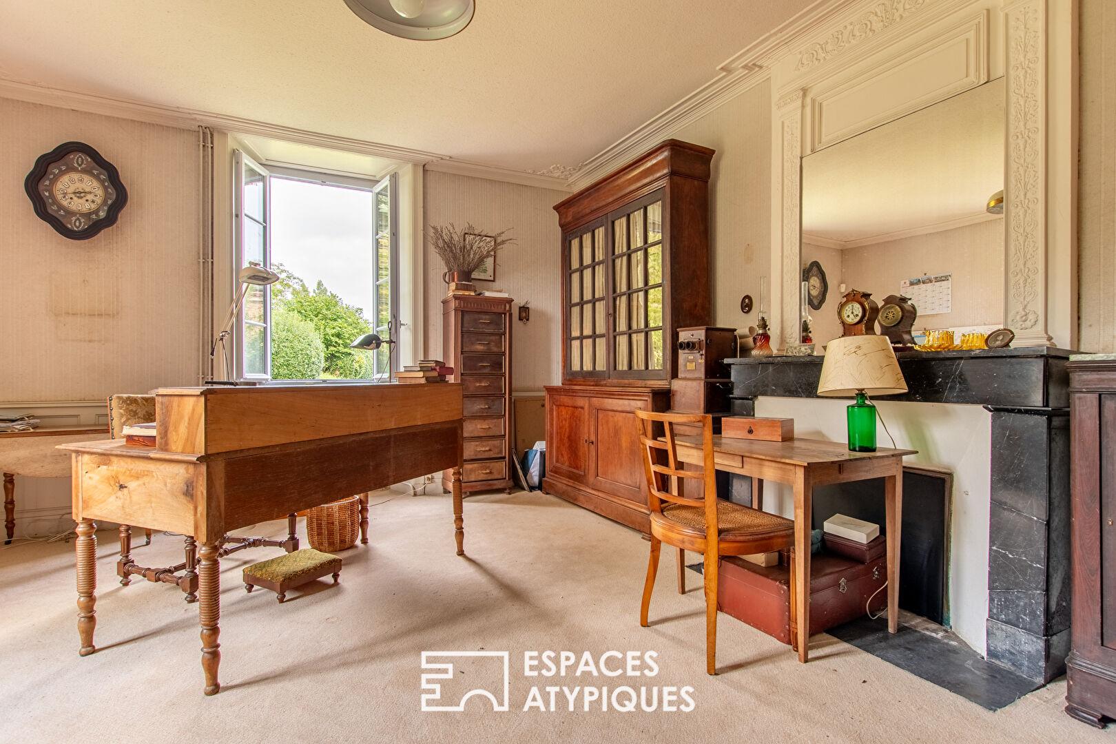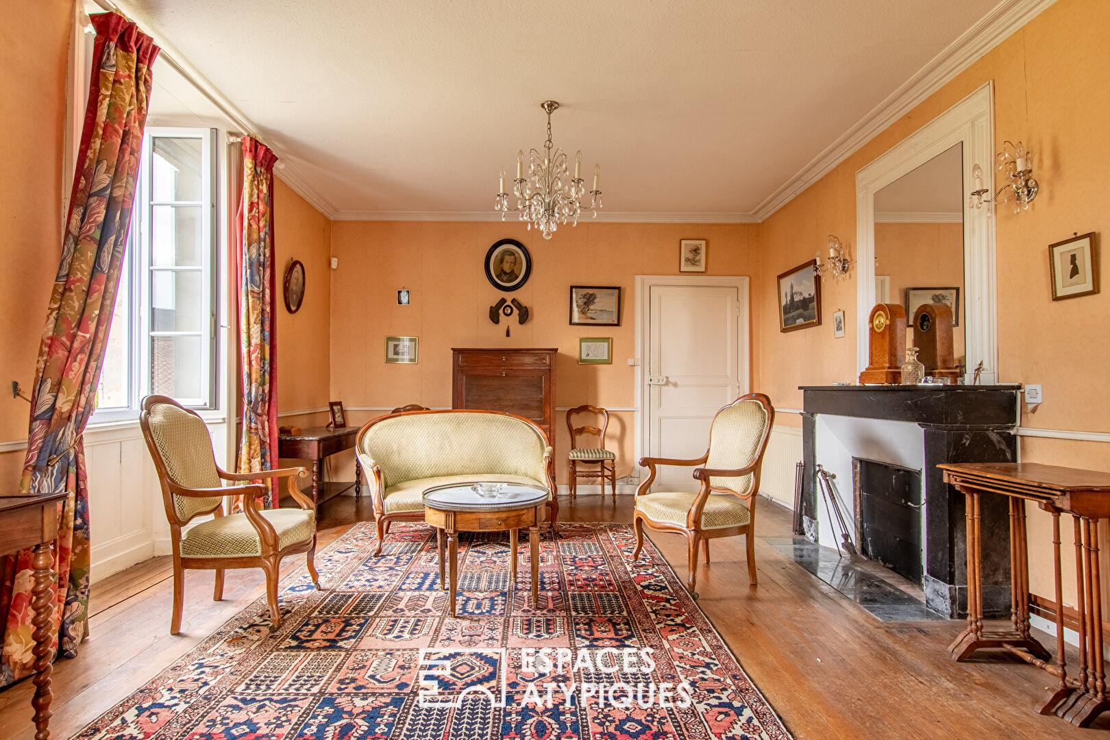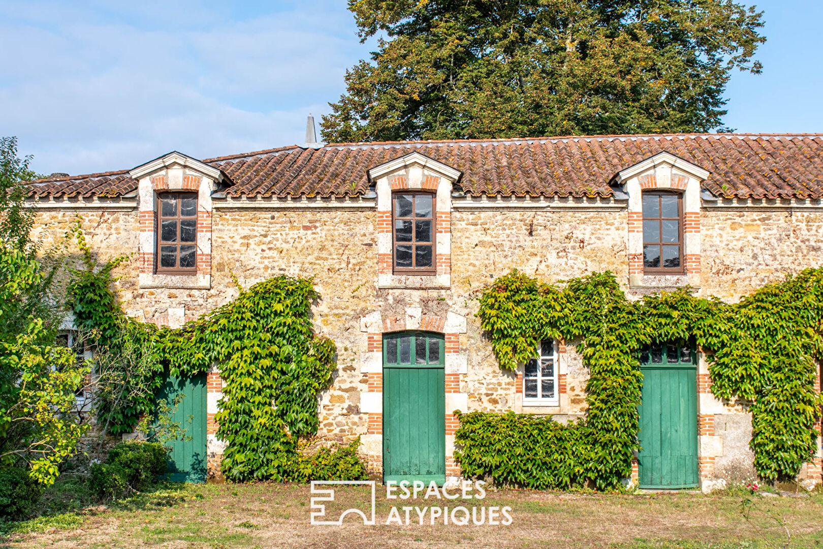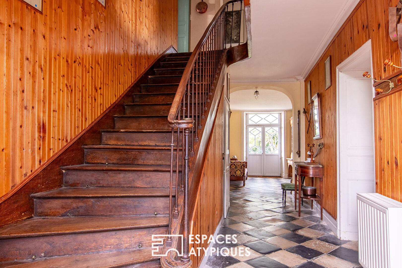 The main stone building, dating from 1850, leads to a majestic, walk-through entrance with its period checkerboard floor and solid wood staircase. The first floor features a wood-panelled kitchen, a beautiful dining room with poetic views over the park, a living room with wood parquet flooring and tapestries, and a comfortable study.