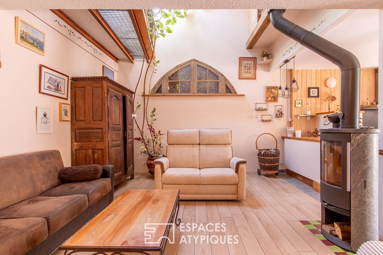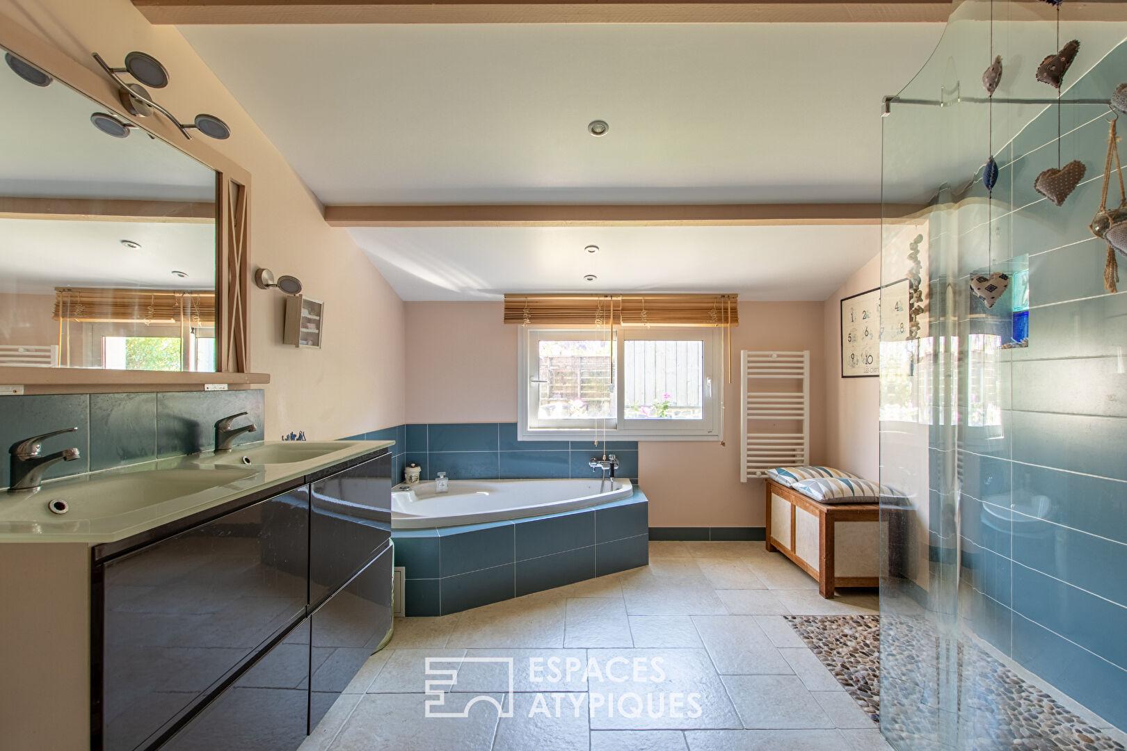 From the moment you enter, the living spaces reveal a warm and inviting atmosphere. The dining room flows seamlessly into a fitted and equipped kitchen, designed for everyday use. The living room, enhanced by a transom window from a former barn and featuring a wood-burning stove, invites relaxation. This level also includes a multi-purpose room, ideal for an office or playroom, complete with a storage mezzanine, as well as a bedroom, a bathroom, a separate toilet, and a laundry room. Upstairs, the landing leads to three bedrooms, a shower room with a toilet, and a library area with a stunning open-plan living room. The main house boasts optimized energy performance, with an energy performance rating of B, thanks in particular to a geothermal system. The adjoining, completely independent gîte features a pleasant living area with a fully equipped kitchen and a lounge/dining room with a wood-burning stove, a bedroom, and a shower room with a toilet, as well as a separate outdoor space offering attractive rental potential.