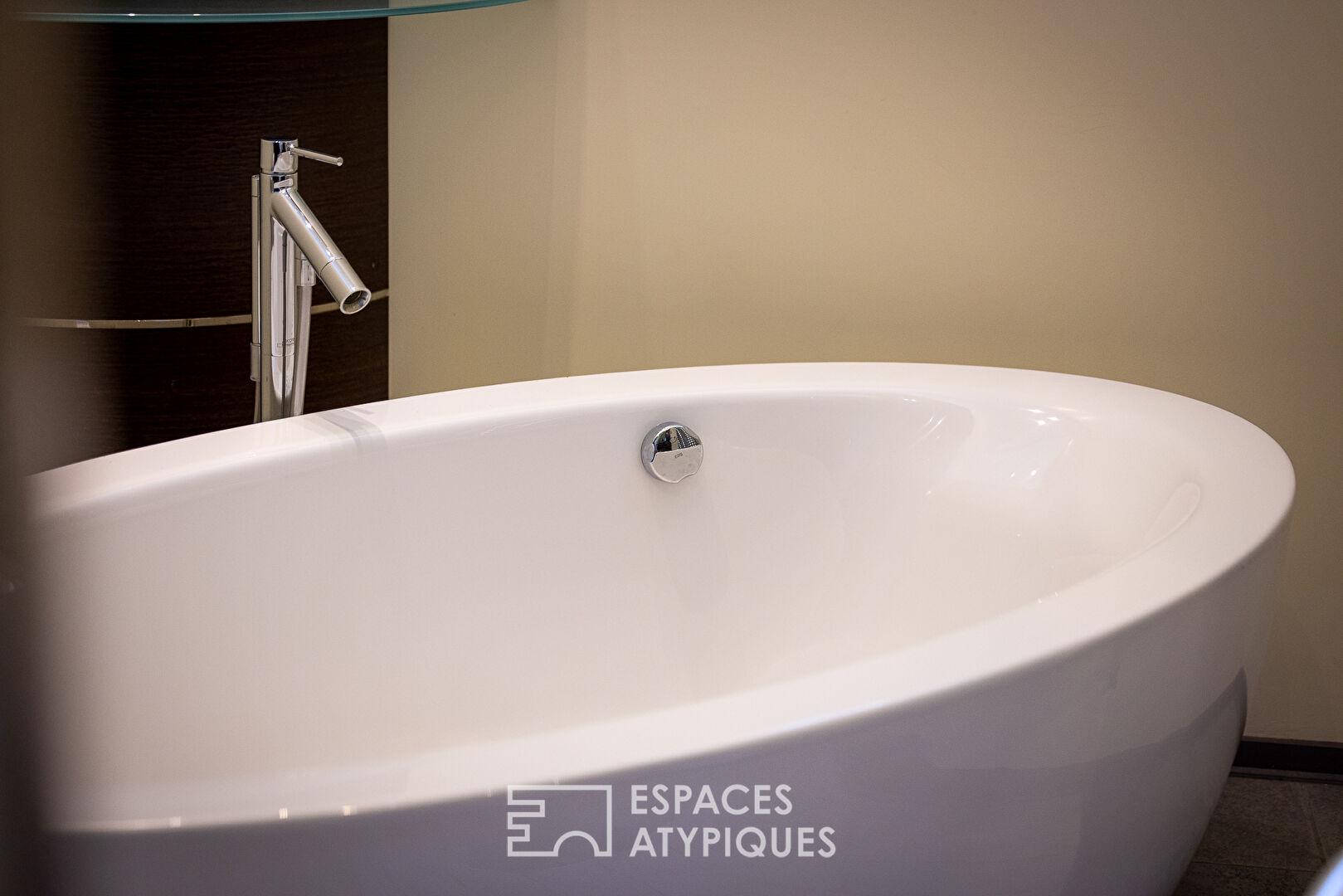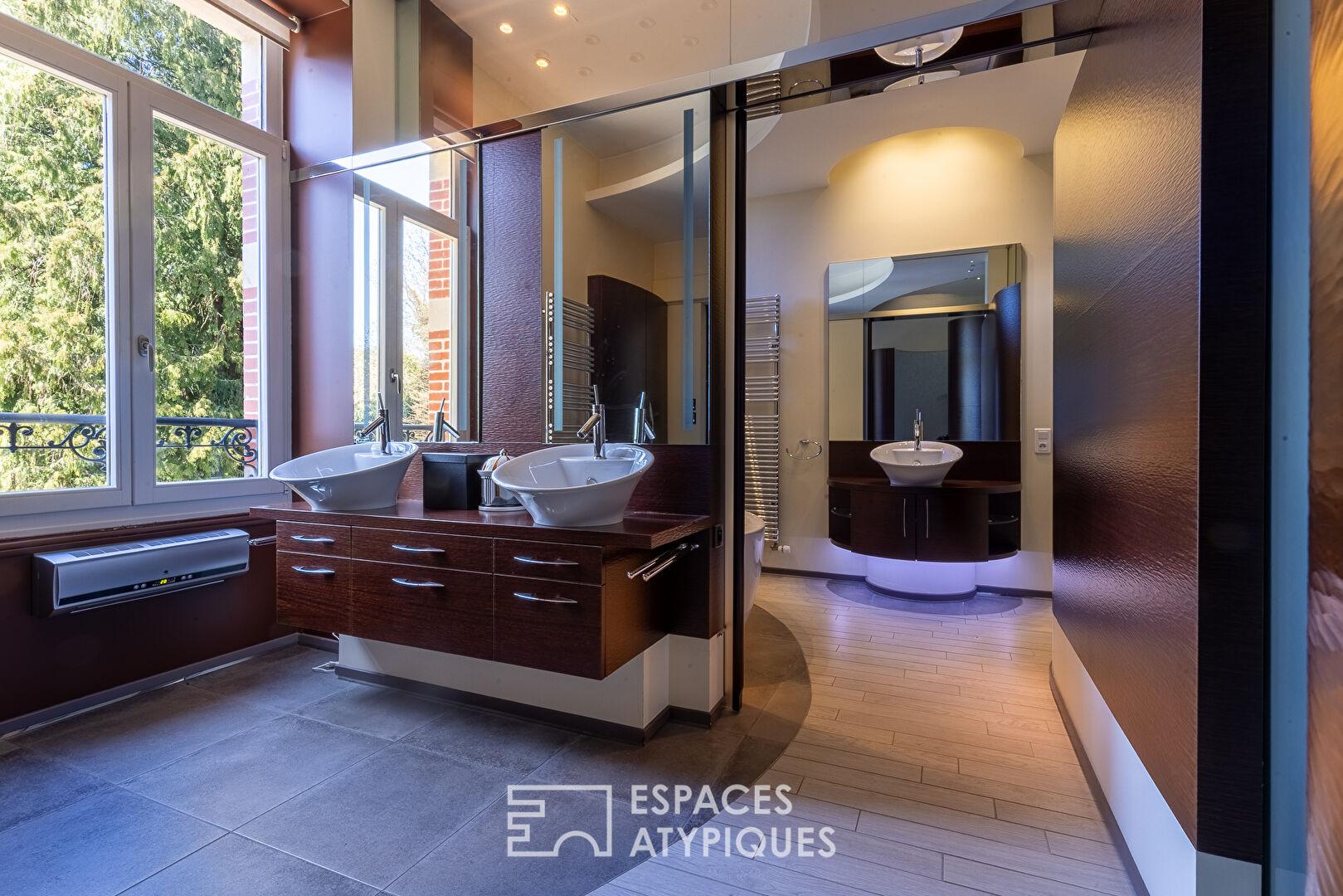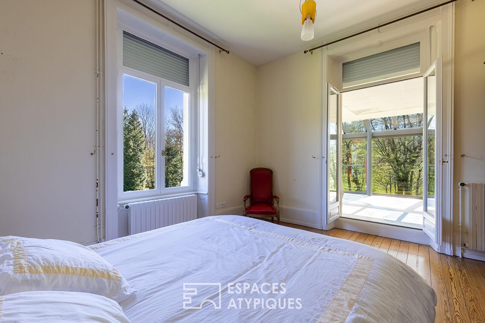 A large, glass-enclosed room, a true invitation to the outdoors, offers a multitude of possibilities: an office, a gym, or a relaxation area with a sink.