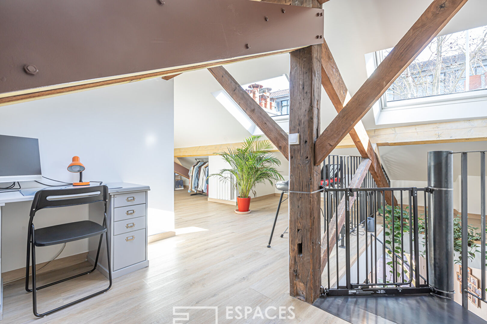 Located in the center, this top floor duplex of 137 m2 (59 m2 Carrez) combining the old and the modern is located on the 3rd and 4th floors without elevator of a small building in Montrouge.