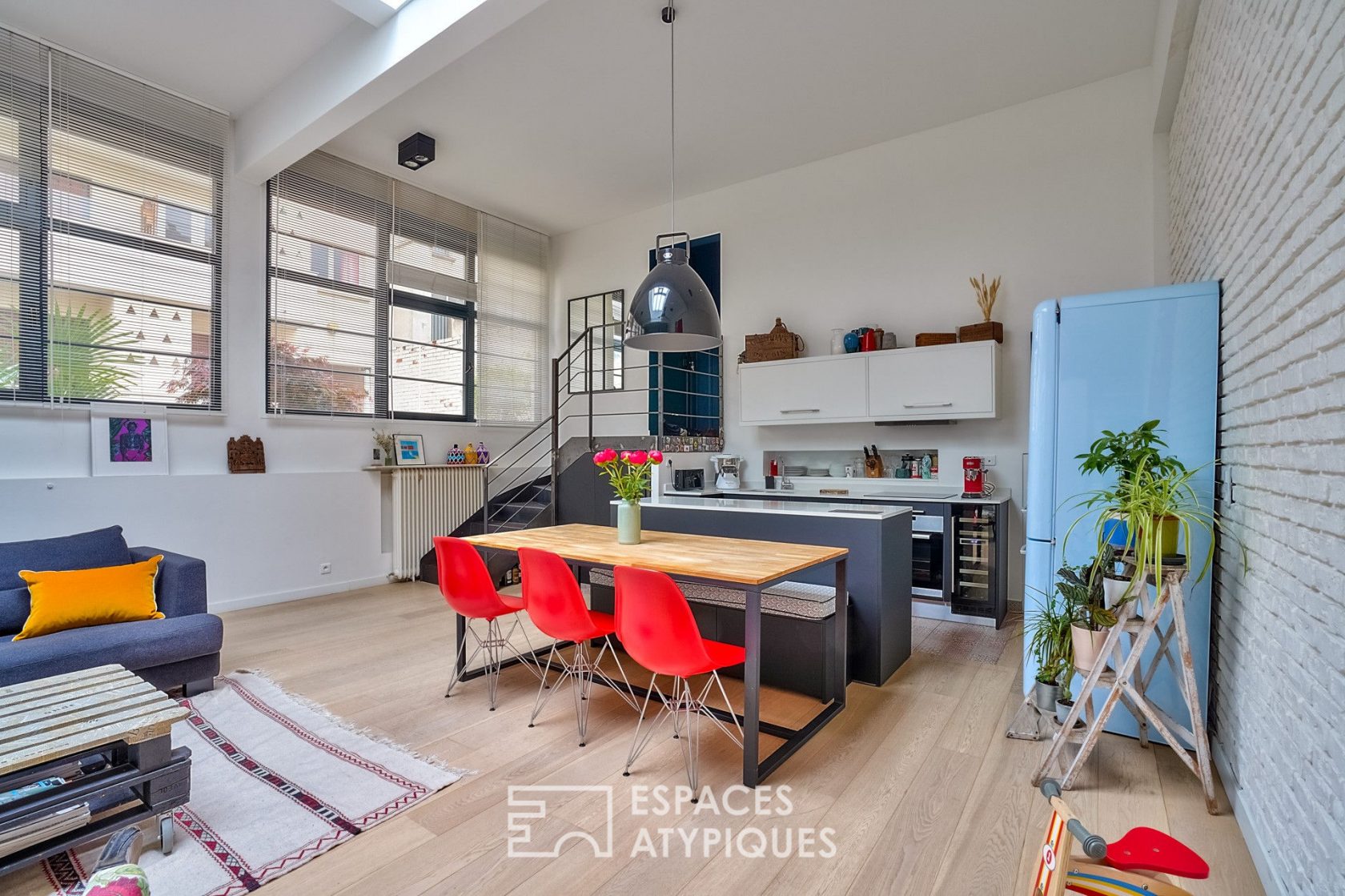 This loft benefits from a parental suite with a bathroom separated by a glass roof and a child’s bedroom in pastel colors. A dressing room has been fitted out under the mezzanine.