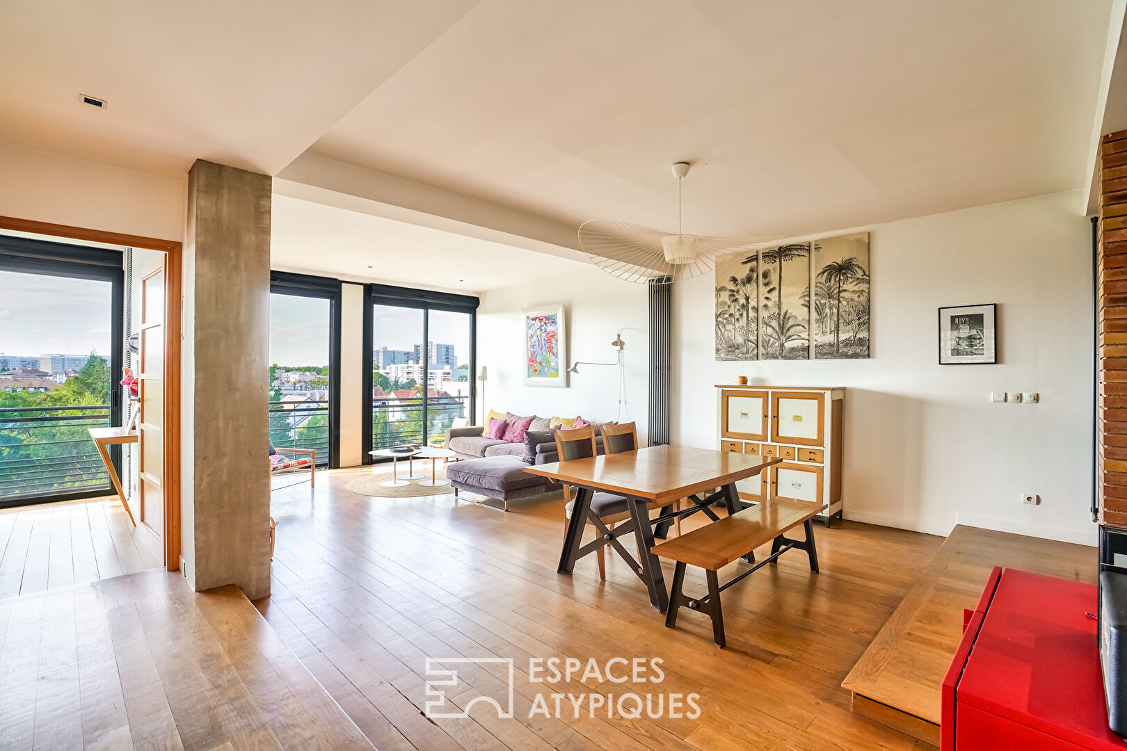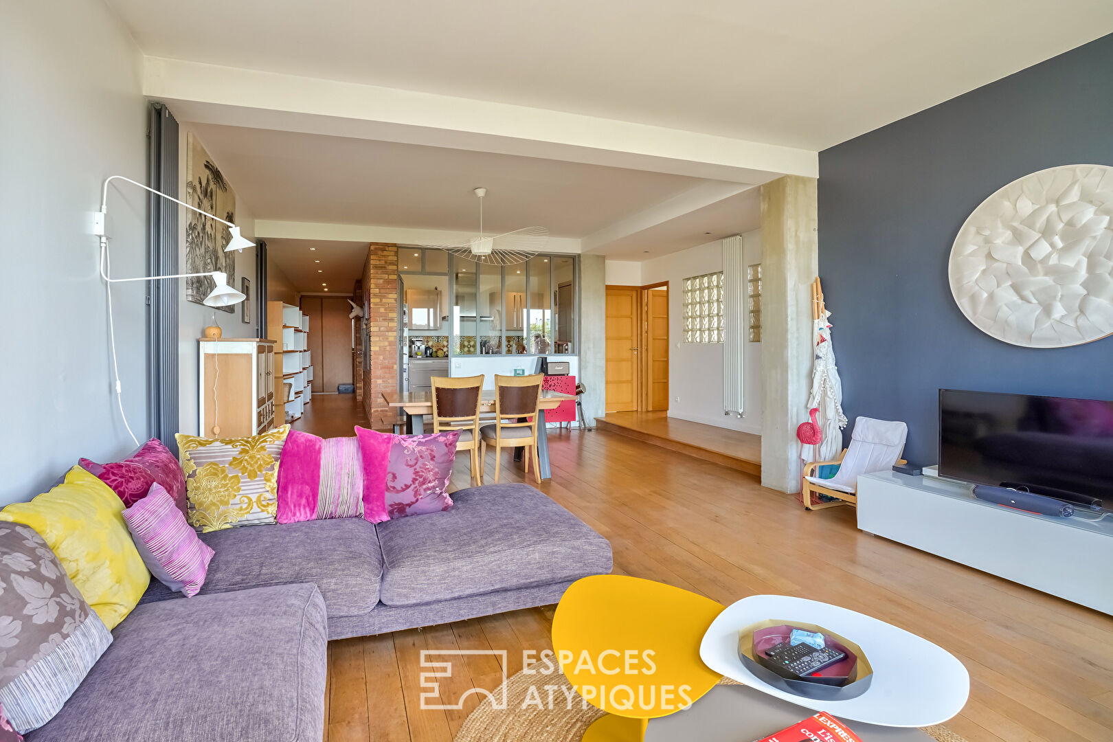 Its original design offers a very beautiful light with an unobstructed view. The closed kitchen and its workshop window, the living room with its wide slatted solid parquet floor, its high ceilings and concrete columns, the brick hallway, all these characteristics give it the assumed loft atmosphere.