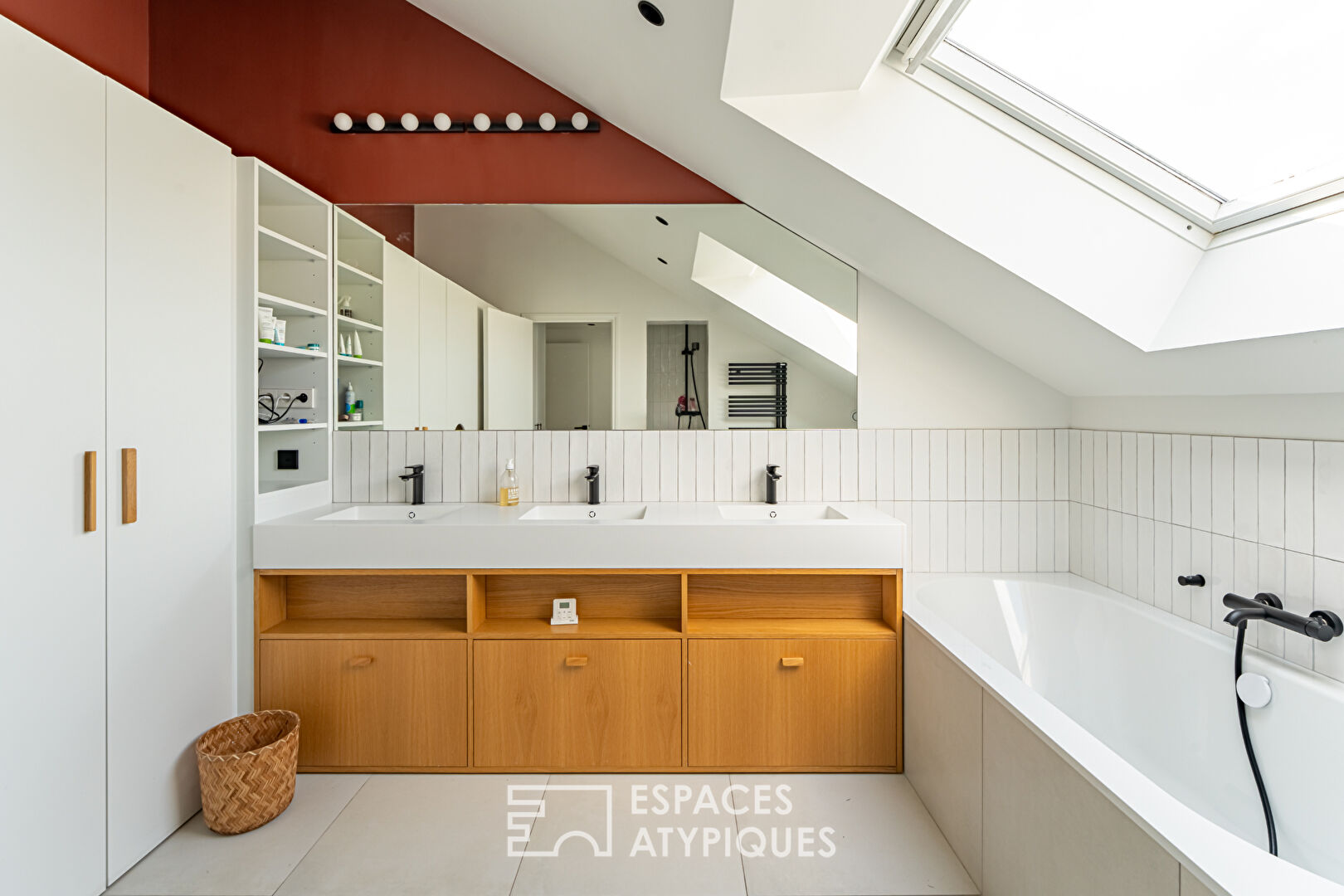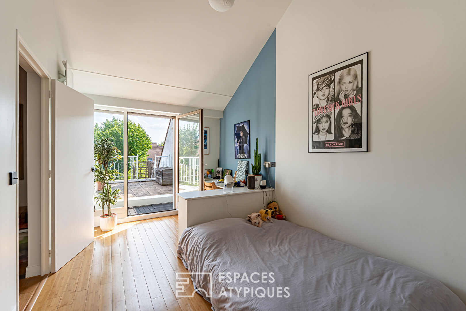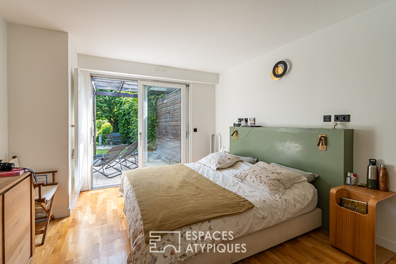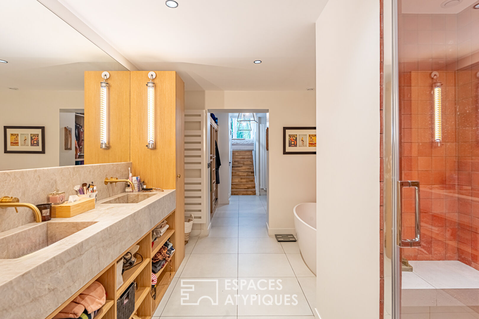 The master bedroom also opens onto the terrace. A few steps down lead to a large dressing room, followed by a beautiful bathroom with a walk-in shower, a separate toilet, a gym, and a large office with its own private entrance in the English courtyard.