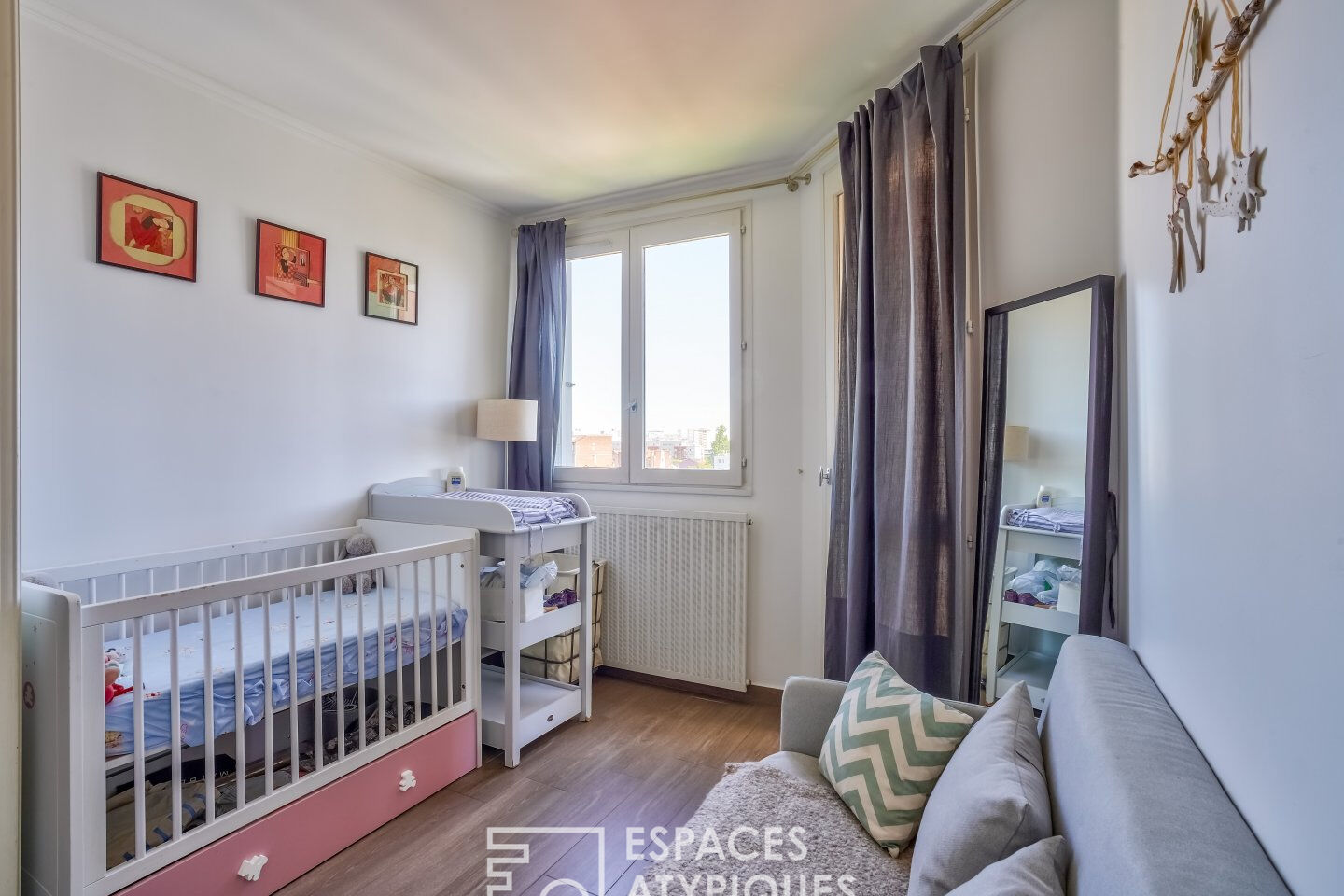 On the edge of Bois-Colombes, on the 6th floor with lift, this family apartment of 80 m2 Carrez has a large green terrace of 105 m2 with an unobstructed view and facing south.