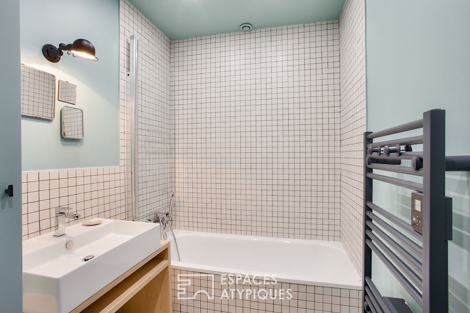 In a former decoration factory, out of sight, a recent loft apartment of 95 m² (94.55 Carrez law) benefits from a 17 m² patio and offers very good amenities in a calm and friendly environment.