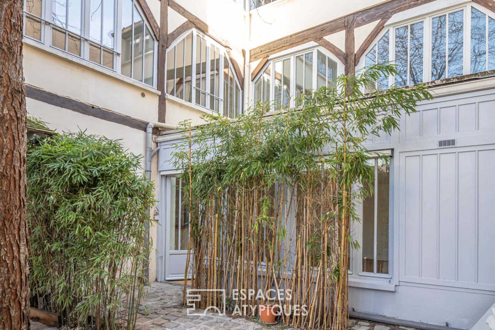 Quietly located in the heart of the lower center of Vieux Puteaux, this former garage-workshop converted into a loft-style duplex of 178 m2 (176 m2 Carrez) is located at the back of a small charming condominium.
