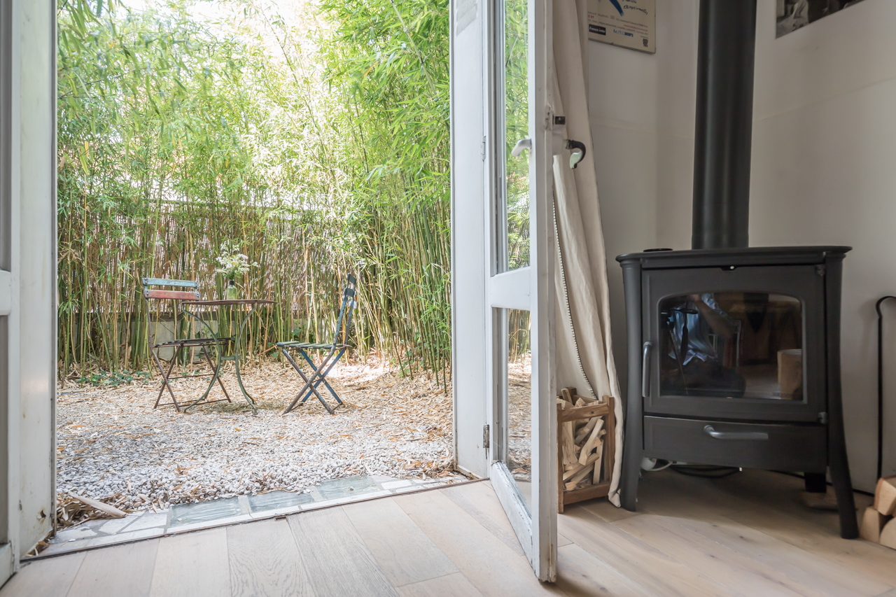 At the back of the house, a furnished terrace adjoins the wooded garden and its shed to form a space of 120m2.