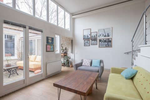 Located in a residential area of Aubervilliers near the Stalingrad Park, this 133.75m2 (120.06m2 Carrez) house-loft with a 26m2 paved courtyard is the result of the rehabilitation of a former signage factory.