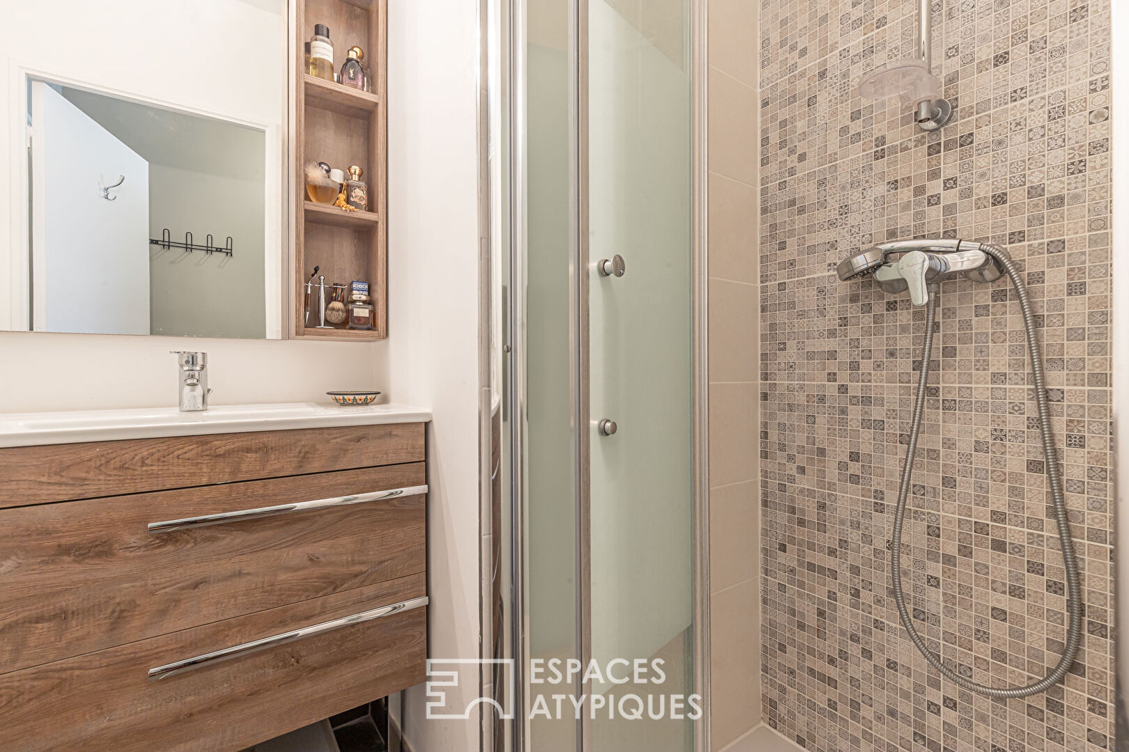 In absolute calm, this space redesigned by an architect benefits from a ceiling height of 3.40 meters and is lit by large windows.
