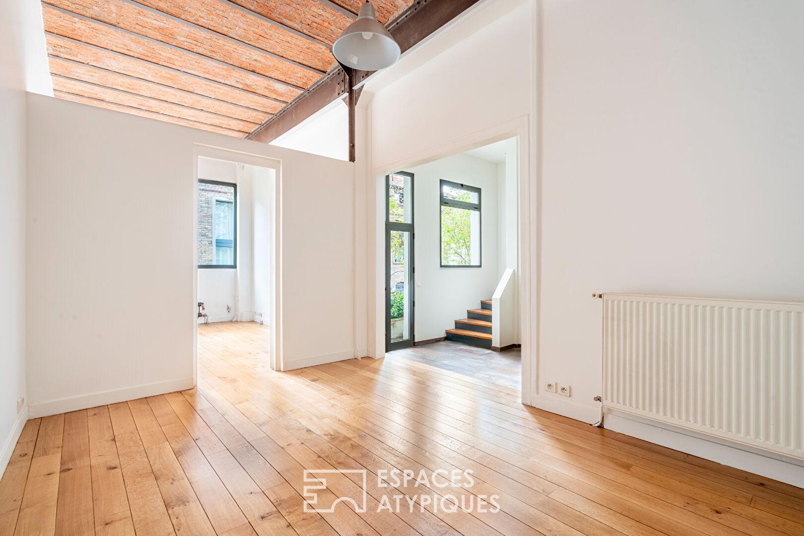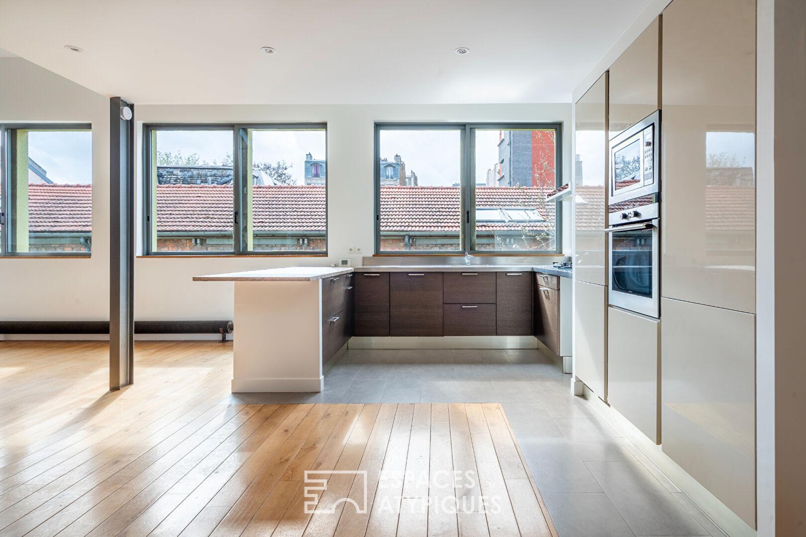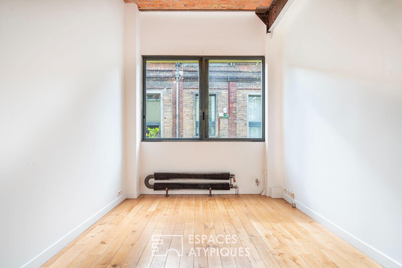 In the immediate vicinity of Paris, between the Parc de la Villette and the Parc Diderot, nestled along a charming private, tree-lined lane, this 171 sq m (157.36 sq m Carrez law) loft, suitable for mixed use, occupies a former distillery renovated by an architect.