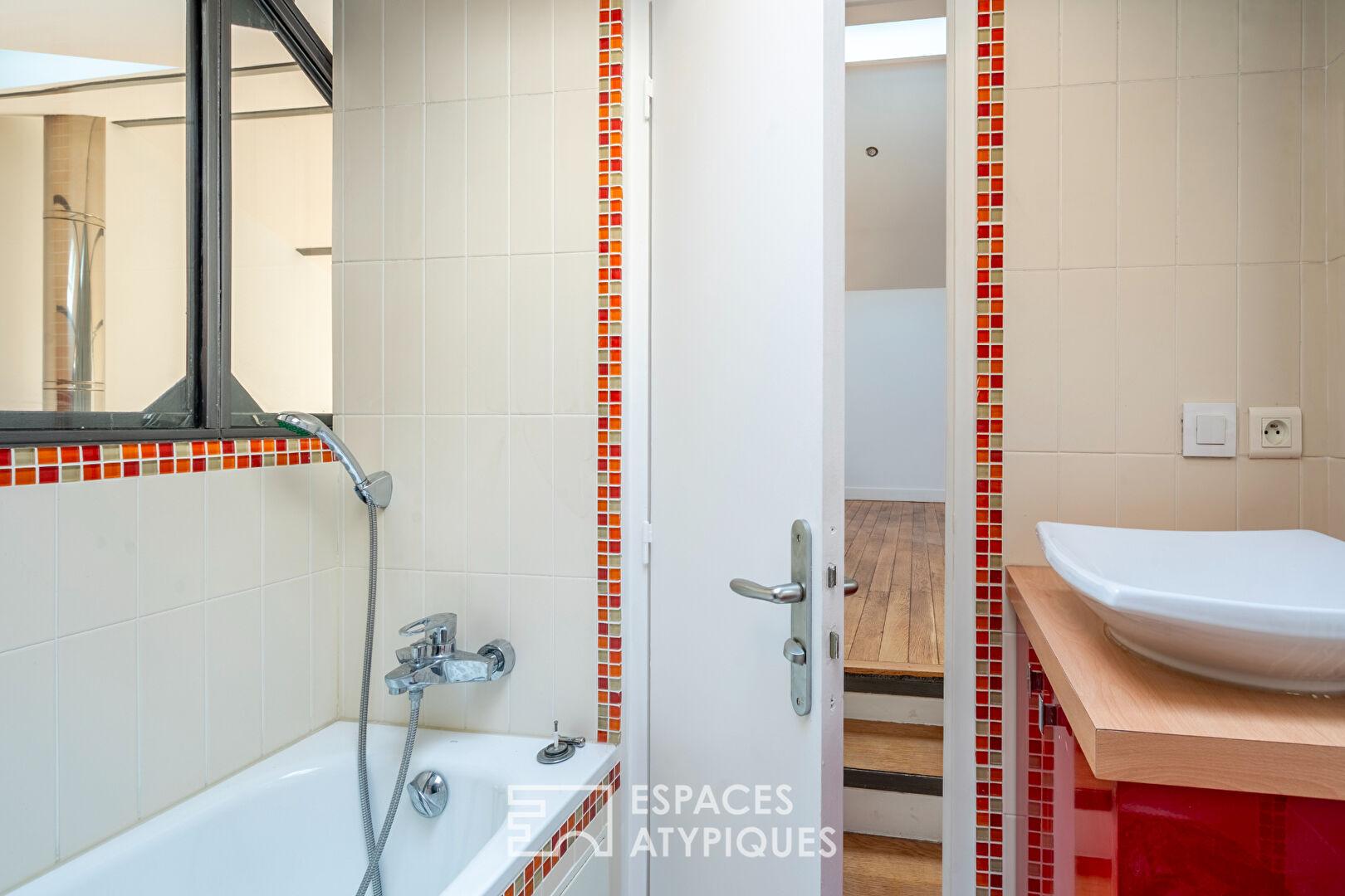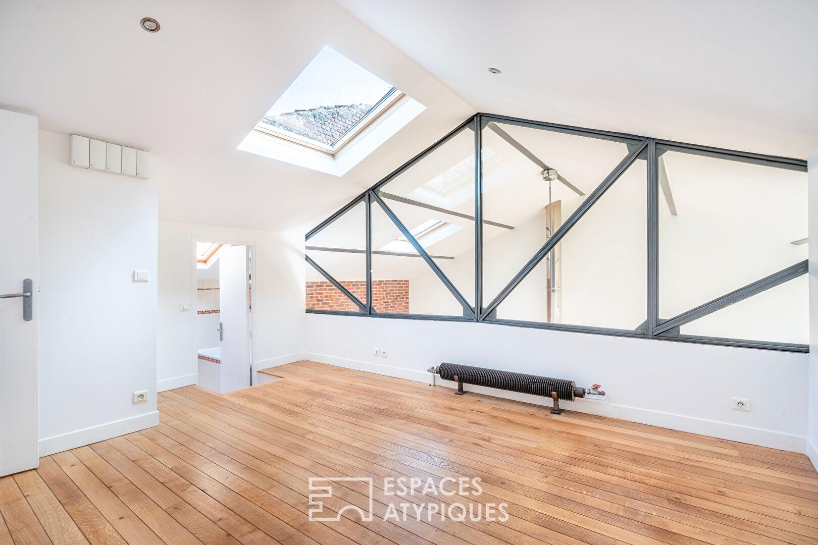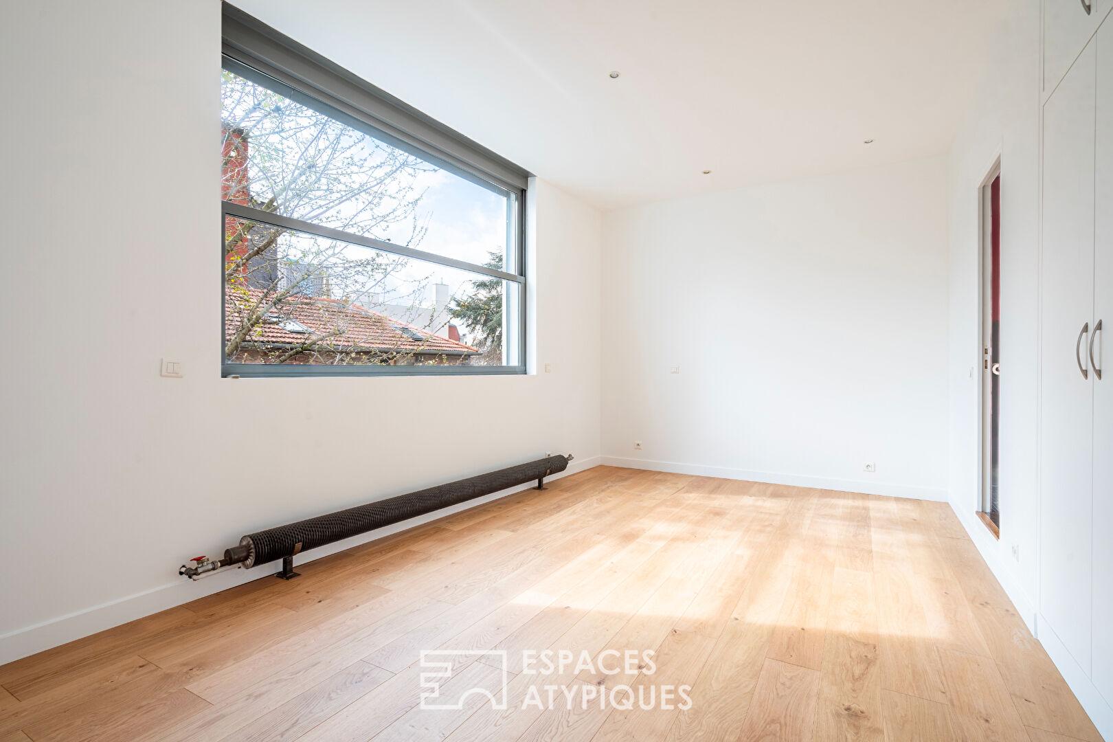 In the immediate vicinity of Paris, between the Parc de la Villette and the Parc Diderot, nestled along a charming private, tree-lined lane, this 171 sq m (157.36 sq m Carrez law) loft, suitable for mixed use, occupies a former distillery renovated by an architect.