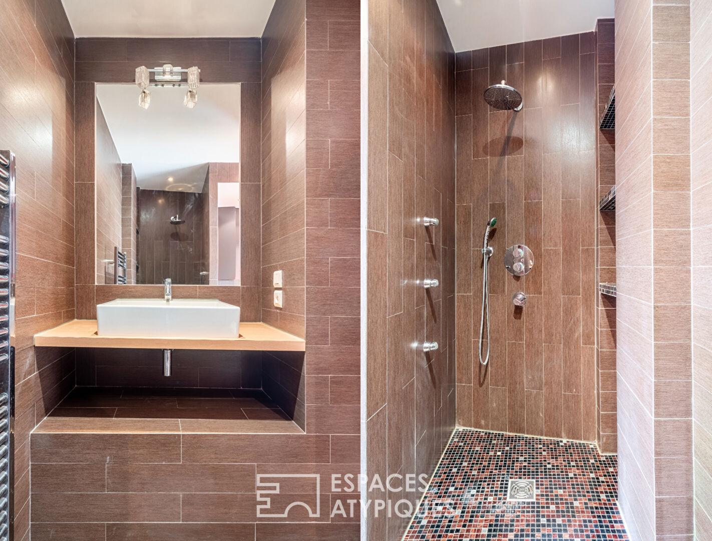 From the entrance, enhanced by custom-built storage, the tone is set. A reception area leads to two adjoining rooms totaling nearly 40 sq m, complemented by a shower room and a guest WC. This independent suite, boasting a beautiful vaulted ceiling, is ideally suited for a professional activity, a reception area, or a self-contained studio.