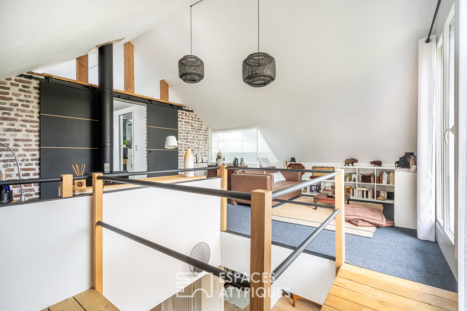 A metal spiral staircase leads to the upper floor, where the atmosphere is decidedly soothing. The space unfolds around a library-lounge, a haven ideal for relaxation or remote working. The space could easily be converted into a third bedroom.