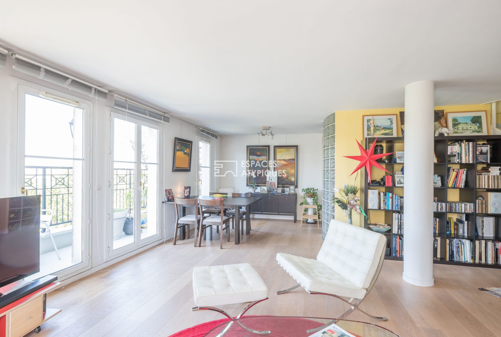 Located on the fifth and last floor with elevator, this duplex apartment with a surface area of 106 m² Carrez benefits from exterior views overlooking the Seine, not overlooked.