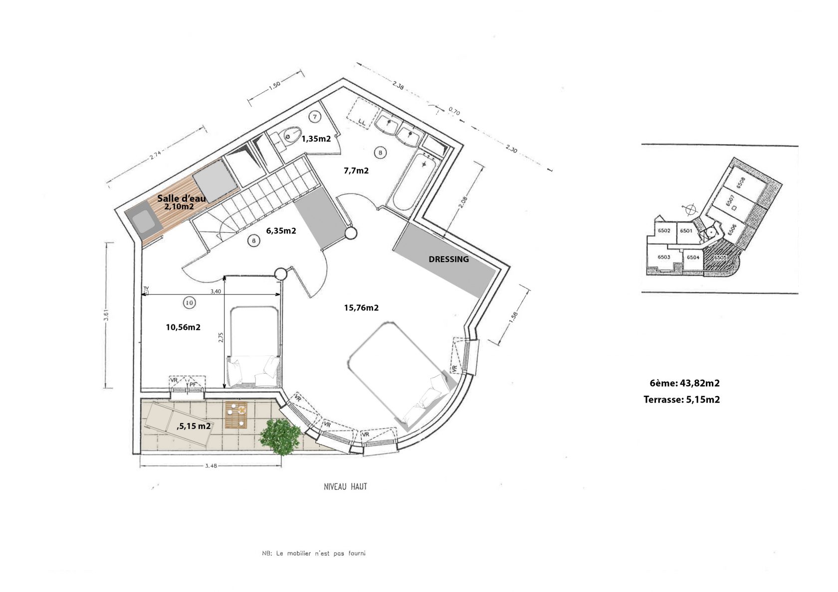 In a house-like spirit, a staircase leads upstairs to a bedroom with direct access to a 5m2 terrace with breathtaking views and a shower room.