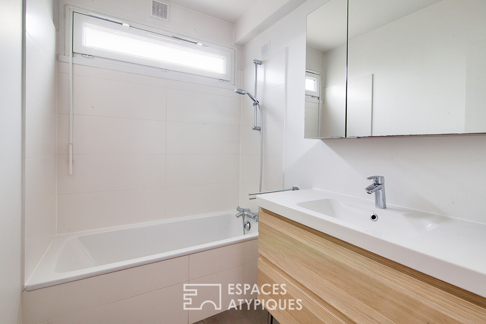 A very large 9m2 corridor houses a custom-made wooden dressing room measuring 4 meters long. It will allow the sleeping areas to be left uncluttered or, if necessary, to install an office area or beautiful bookcases.