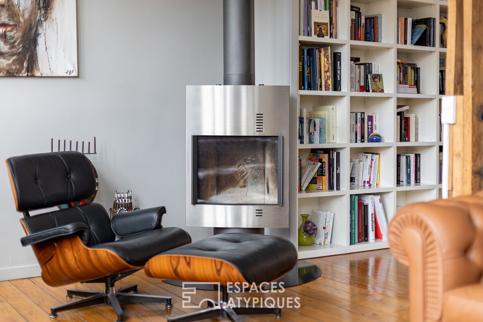 A custom-made metal staircase provides access to a first level leading to a living room, an impressive library and a more intimate reading area. This one, with its own balcony, can easily be transformed into a bedroom.
