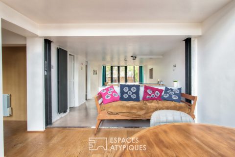 Located on the Fannac Island of Joinville-le-Pont, in the immediate vicinity of the RER A, this architect-designed house with metal and wood cladding takes place in lush greenery of 201m². and develops a surface area of 102 m² of living space spread over 2 levels.