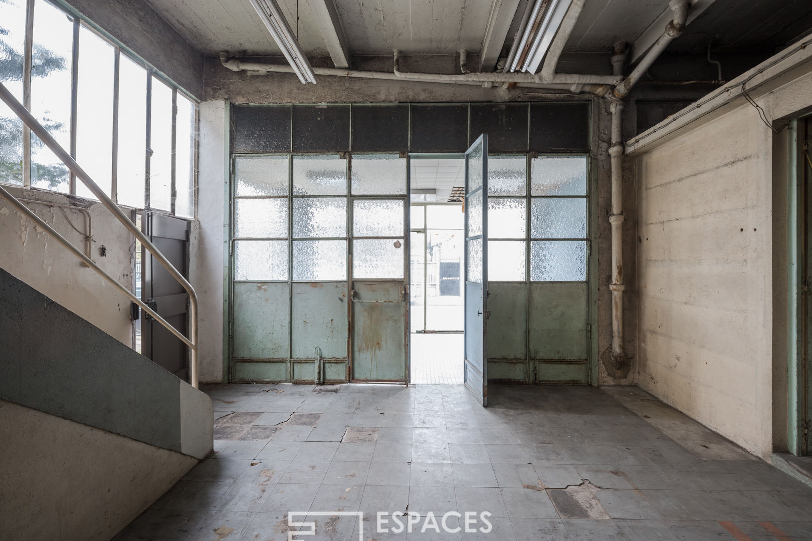 On the ground floor, a warehouse enjoying 4 meters high ceilings and commercial premises, a surface of 198m2. The first floor comprises two main rooms, a bathroom and a kitchen, all for a surface of 59m2. A terrace adjoining the living is added to this level. The combination of generous volumes, glass roofs and industrial past that the walls shelter, make places a unique place.