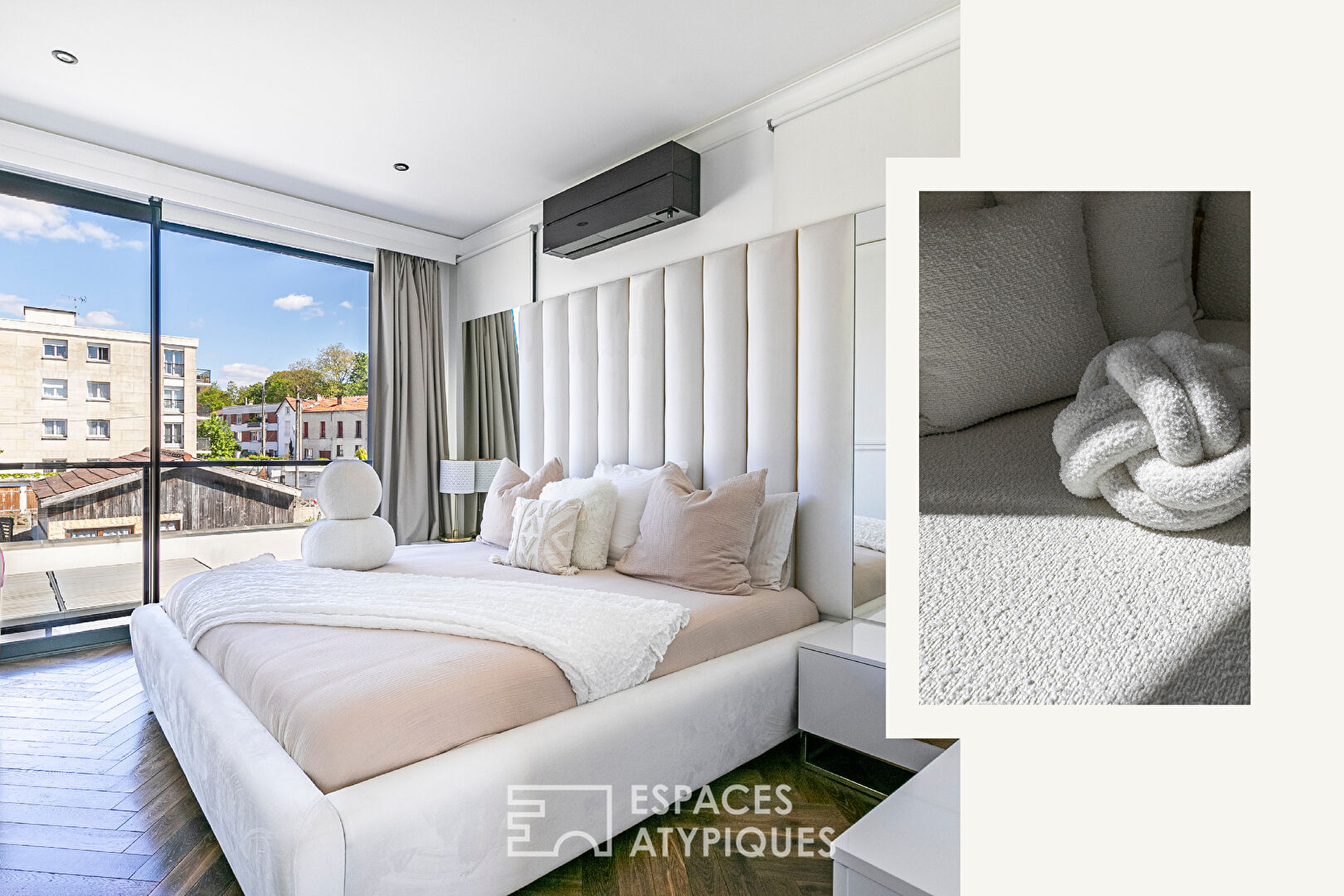 The resolutely modern white facade of this building is revealed in the extension of this first exterior space.