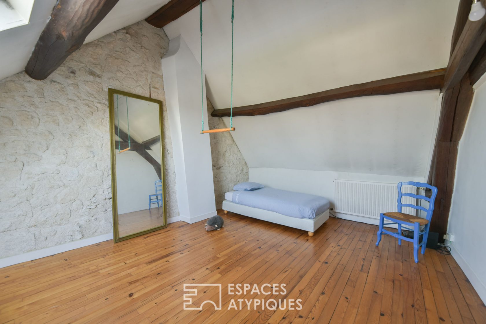 This unique place, located in a small protected village, close to rail and road axes, and daily amenities, offers atypical architecture. The facade on the courtyard (heritage to protect) of the old building, is added to a facade on the garden, partly in glass pavers.
