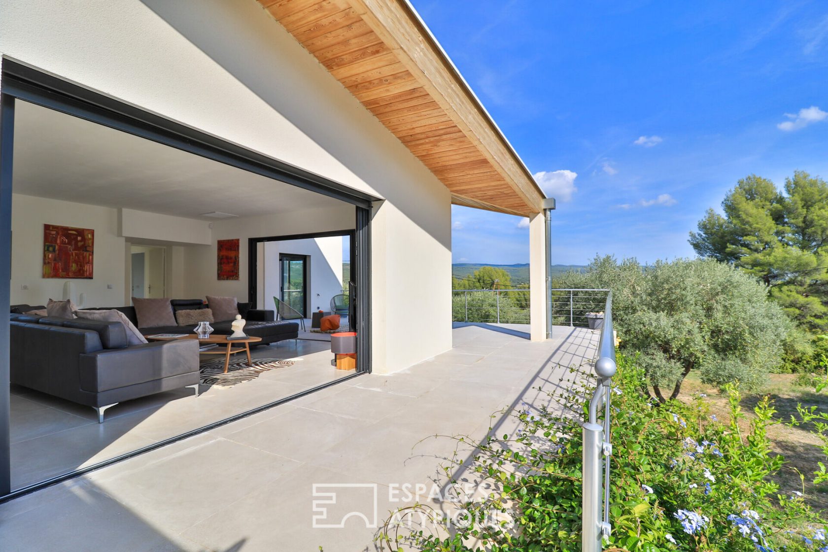 On one level and perfectly calibrated, the architecture spreads its wings by imposing a U-shaped building that welcomes you through its interior courtyard. An alley of olive trees leads to the entrance, the center of the living space which plays with openings on the panoramic views, the terraces and the swimming pool.