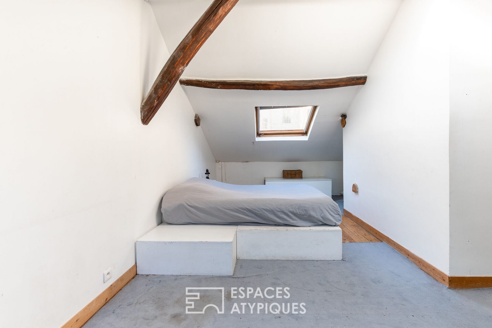 From the courtyard, a private staircase leads to the first floor comprising two workshops of 70m2 and 36m2, decorated with glass roofs, exposed beams and original floor tiles. These open-air workshops have a ceiling height of up to 4.8 meters. An independent toilet completes this level.