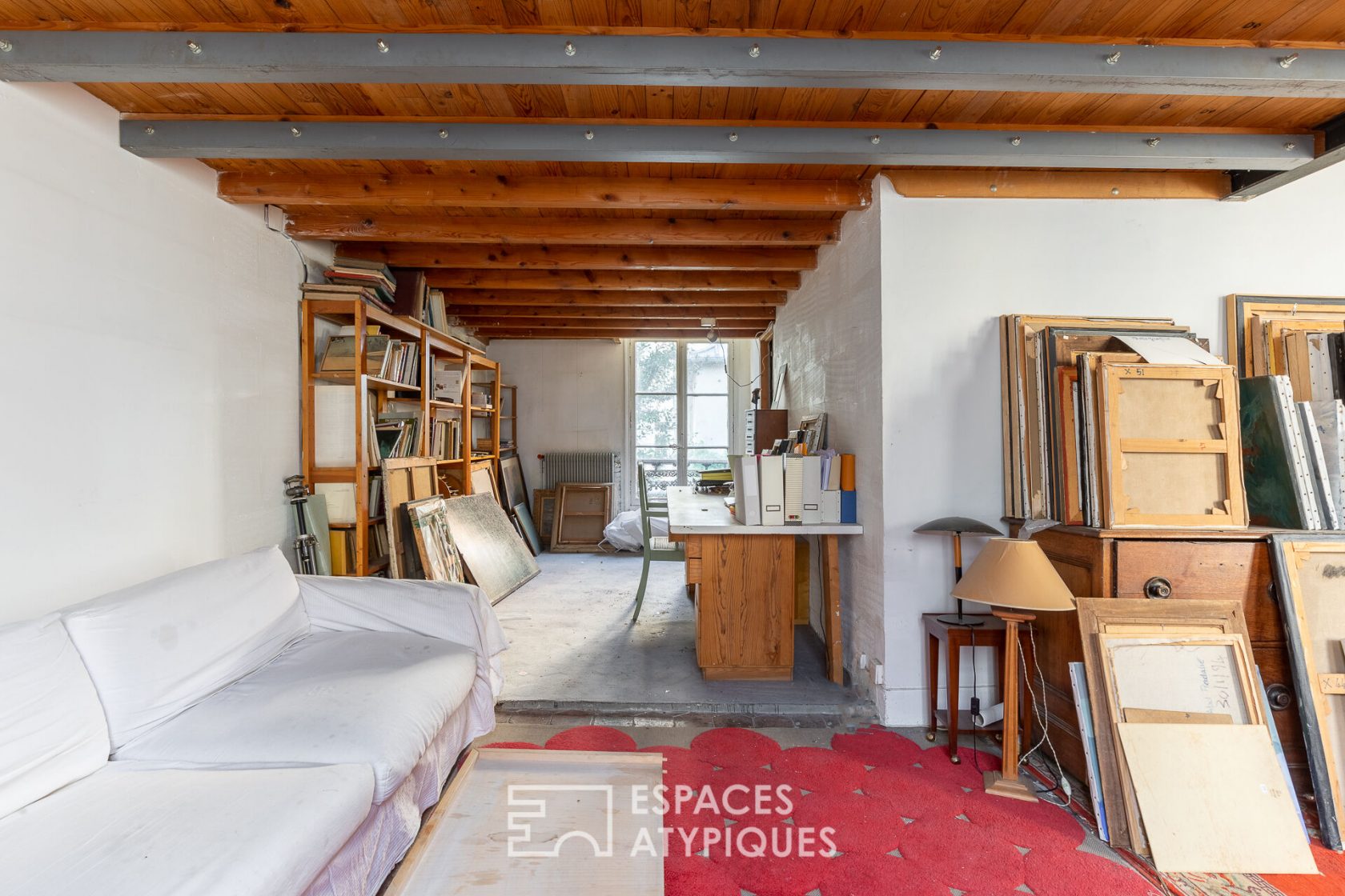 This former painter’s studio with mixed status (studio / office and home), calm and full of light, offers many possibilities for arrangements.