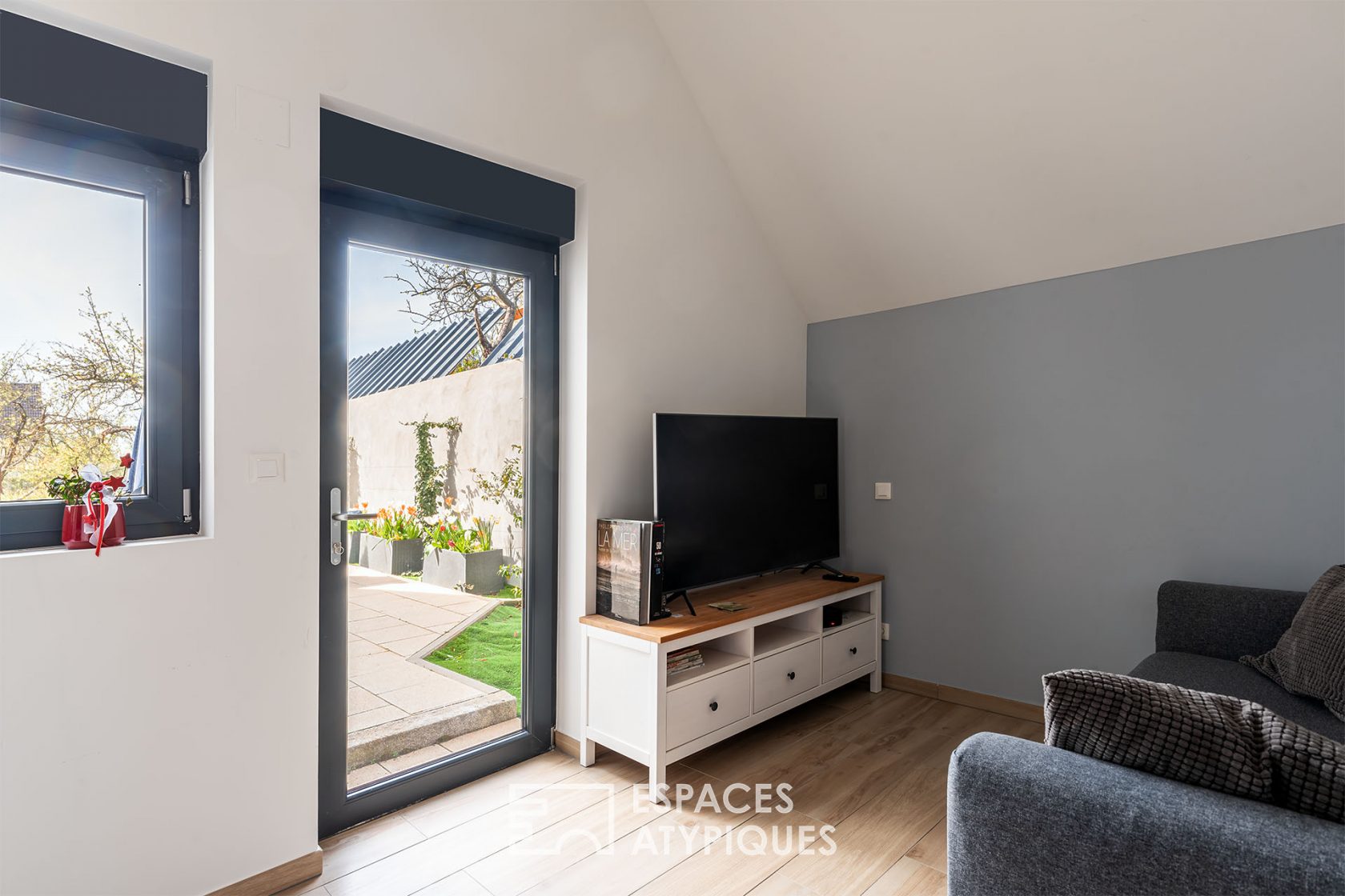 The ground floor is home to a vast 58 m² living room bathed in constant light thanks to its triple exposure. It includes a pleasant living room opening onto the terrace and the garden, as well as an open kitchen decorated in dark, woody colours. From the latter, a discreet cupboard door hides a laundry area and a bedroom with its own private bathroom. Perfectly suited to welcoming guests in complete privacy, this suite opens onto a second terrace sheltered from view and extended by the garden. The upper floor has an office with a glass roof, two bedrooms, a bathroom with bath and walk-in shower and a master suite with its own shower room.