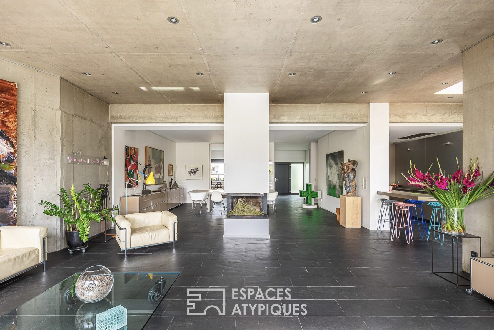 From the moment you enter, the tone is set and concrete in all its forms reigns supreme. A spacious living room of almost 100 m² with a high ceiling of over 3 metres. The day room is adorned with a triple fireplace as well as large bay windows that bathe the space in an abundance of light. The latter give way to an unobstructed view of the wooded grounds and its swimming pool. A semi-open Bulthaup kitchen adjoins the living room. An office with large sliding doors and a laundry room that can be used as an additional shower room complete this level.
