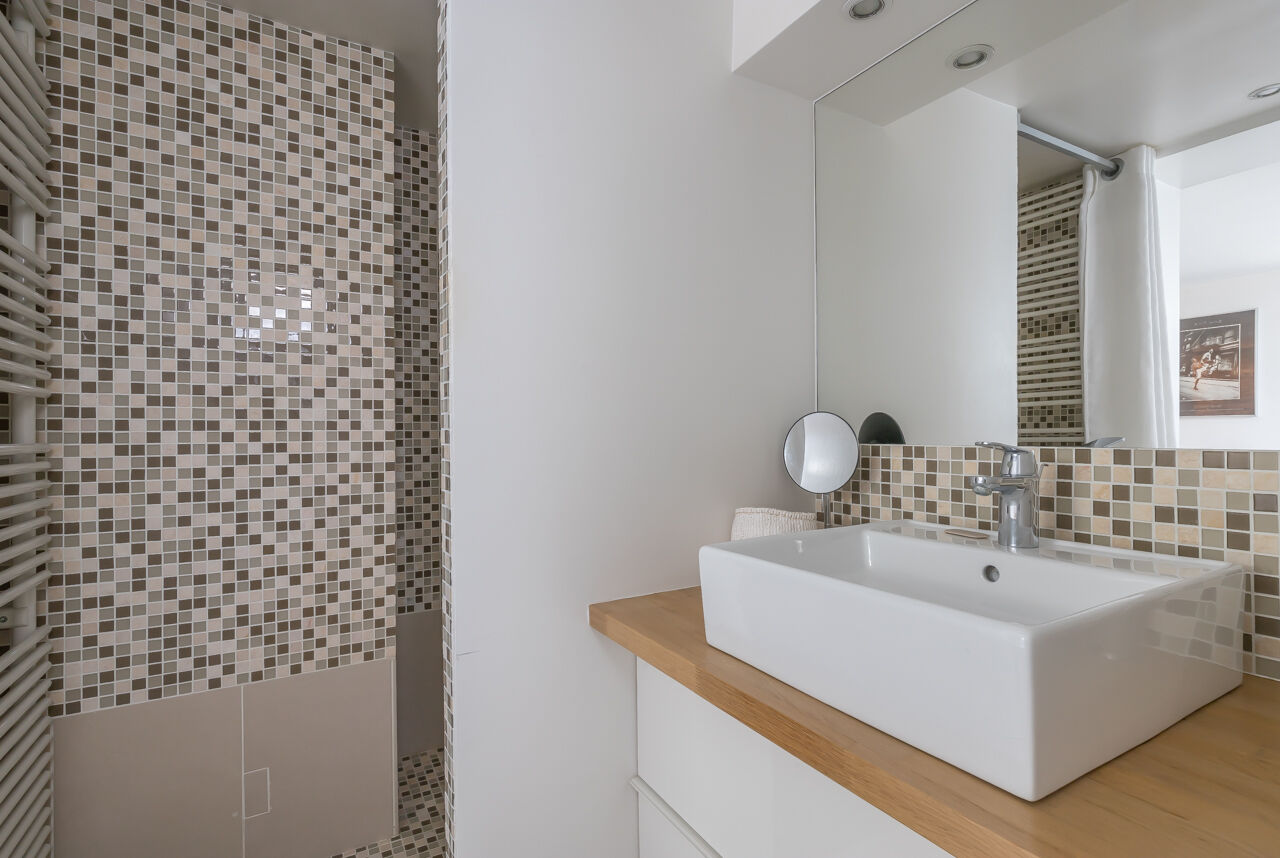 The front door opens onto an open-space living room which synthesizes the codes specific to lofts from the very first moment. The volume benefits from a high ceiling as well as constant brightness thanks to large openings and overhead light. A mezzanine, half office, half relaxation area with a bird’s eye view of the living room, completes this space and can serve as an extra bedroom.