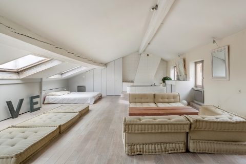 Located at the top of the slopes of the Croix Rousse, in the immediate vicinity of the large pebbles and all amenities, this 76sqm apartment (48sqm carrez) designed as a real loft is nestled on the 5th and last floor of an old building.