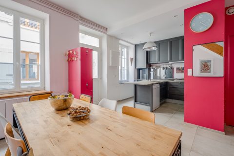 Located in a dead end, in the town of Caluire, quiet, close to all amenities, this 72sqm town house has been completely renovated. The entrance opens onto a first living room where the fully equipped kitchen faces the dining room. Another more cozy living room takes place upstairs also composed of a bedroom and a bathroom.